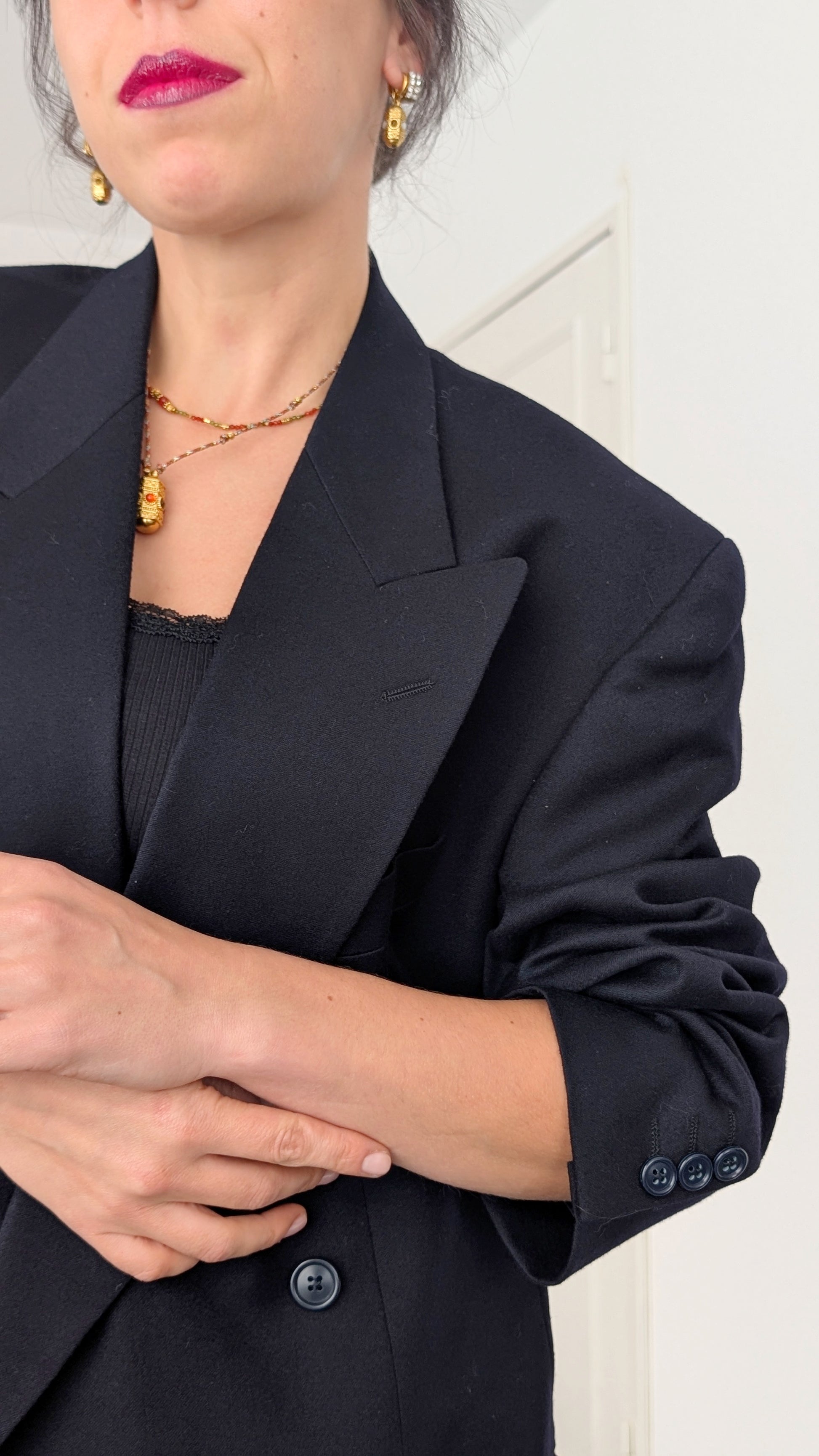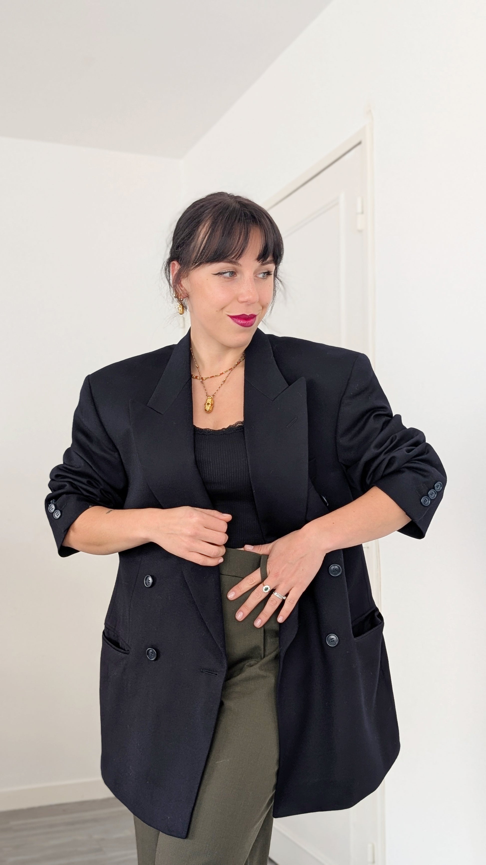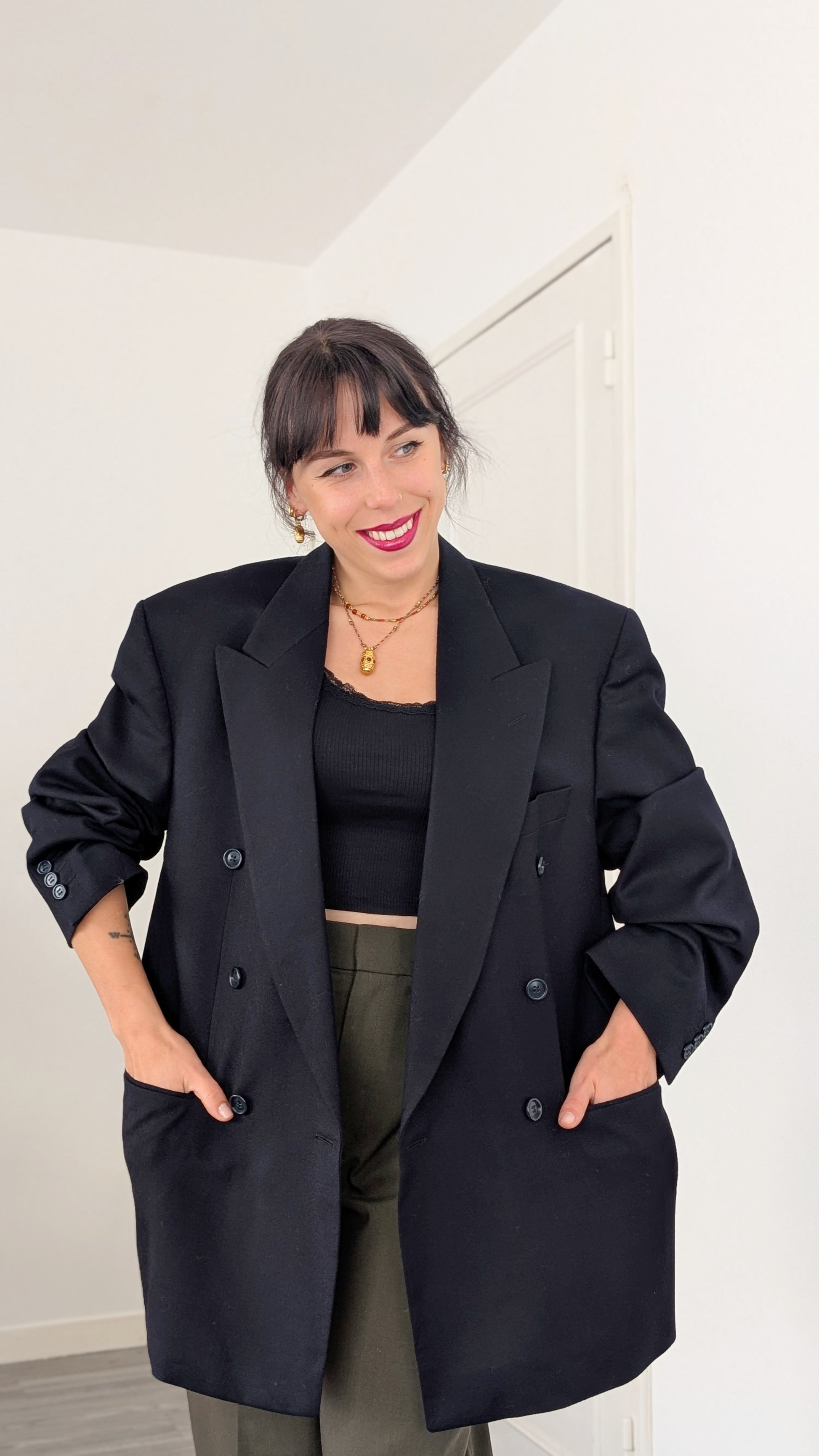 Détails : années 1980, coupe classique, masculine, très belle matière douce, état impeccable, poches latérales, tombe oversize sur les T42-44