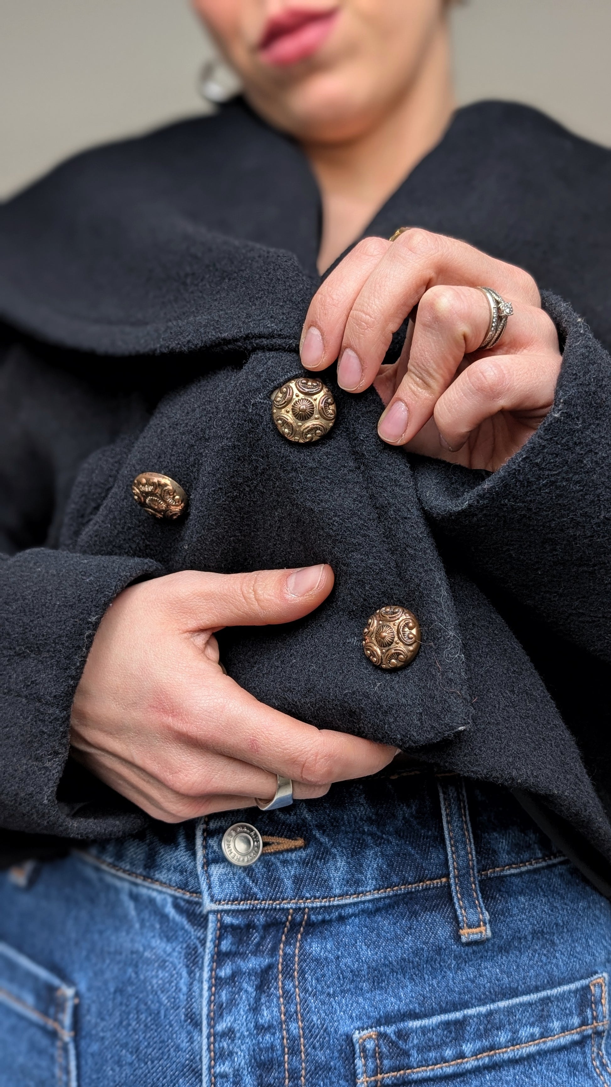 Détails : années 1980, boutonné sur le devant, poches latérales, col bateau large, boutons bijoux, superbe coupe à porter avec des tailles hautes