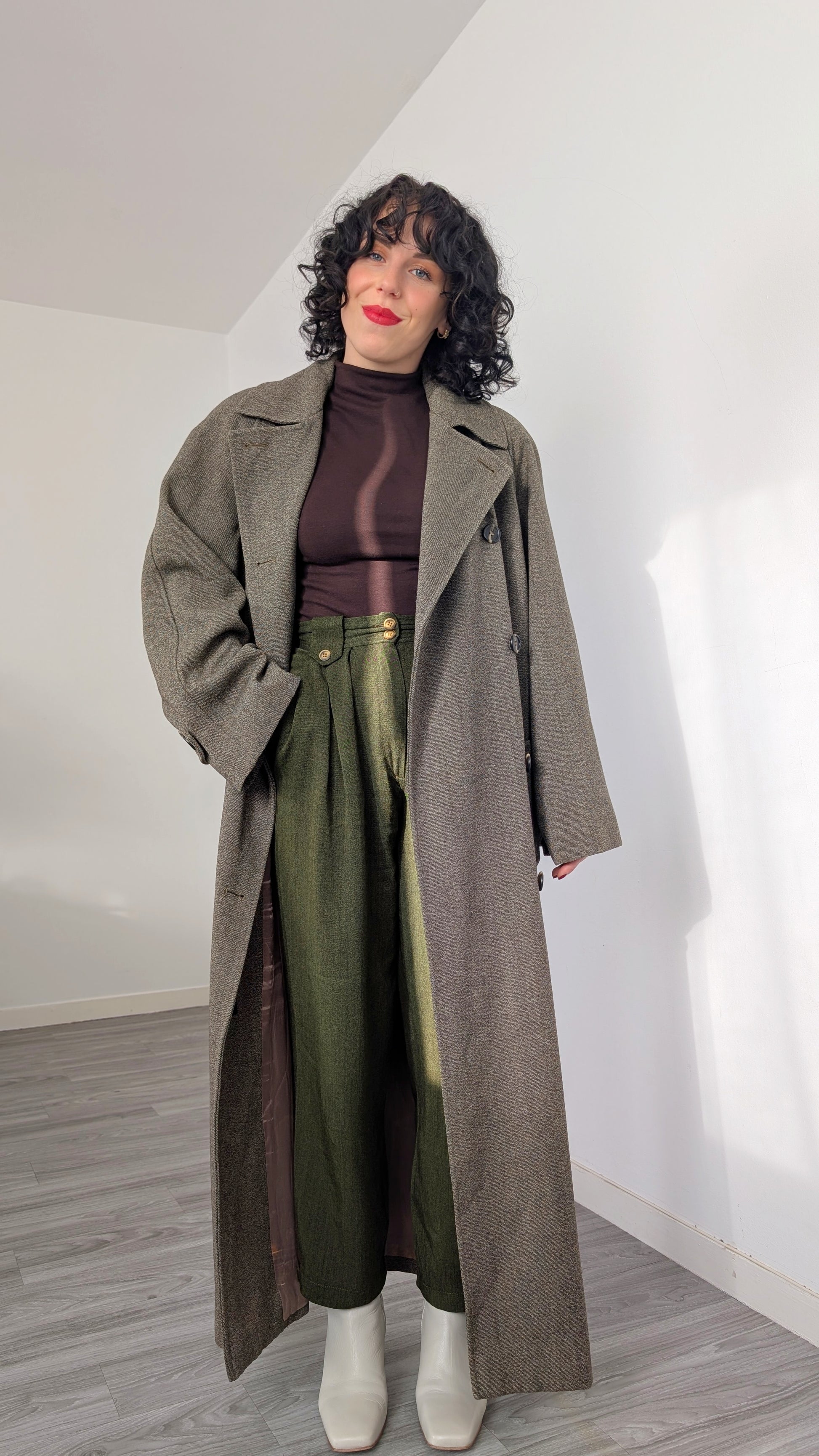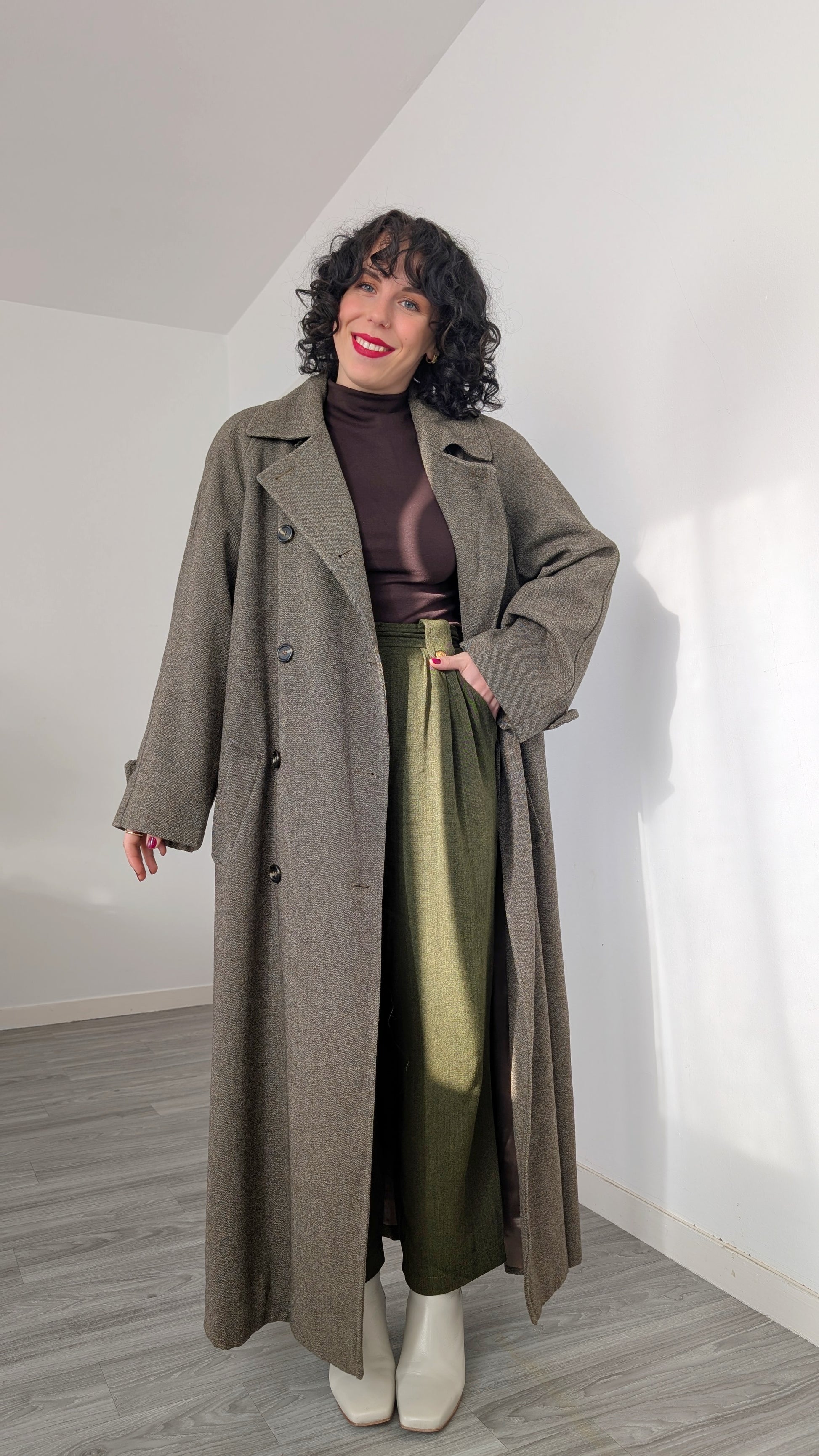 Détails : années 1990, coupe ample, se porte en oversize, poches latérales, coupe longue, superbe qualité, épais, je lui ai rajouté une ceinture en cuir (vendue avec), mais vous pouvez lui ajouter n'importe quelle ceinture vous voulez, tout petit défaut sur la doublure tout en bas (voir photo)