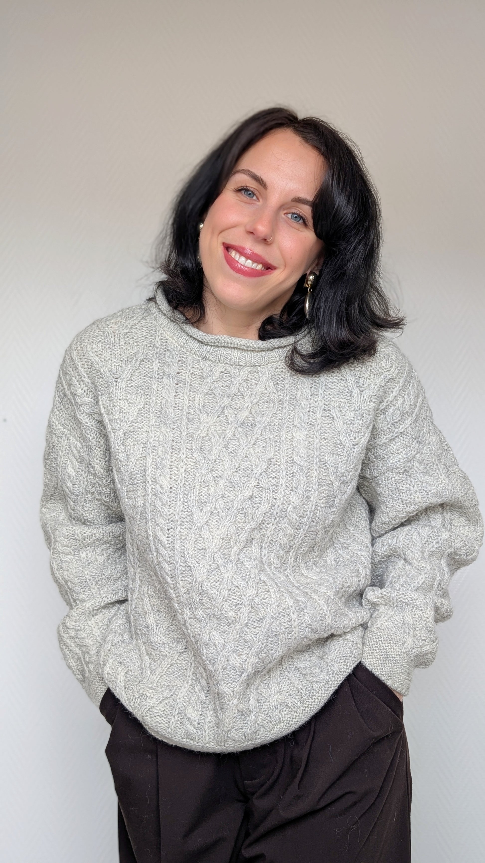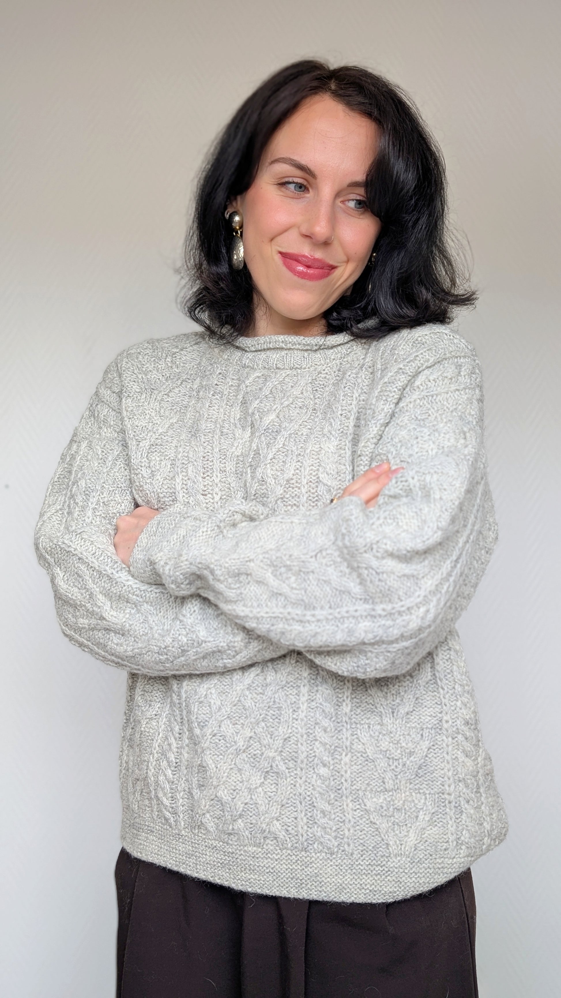 Détails : années 1980, fabriqué au UK, laine qui ne gratte pas, très belle qualité, classique irlandais, épaules tombantes donc ça convient à bcp de tailles différentes
