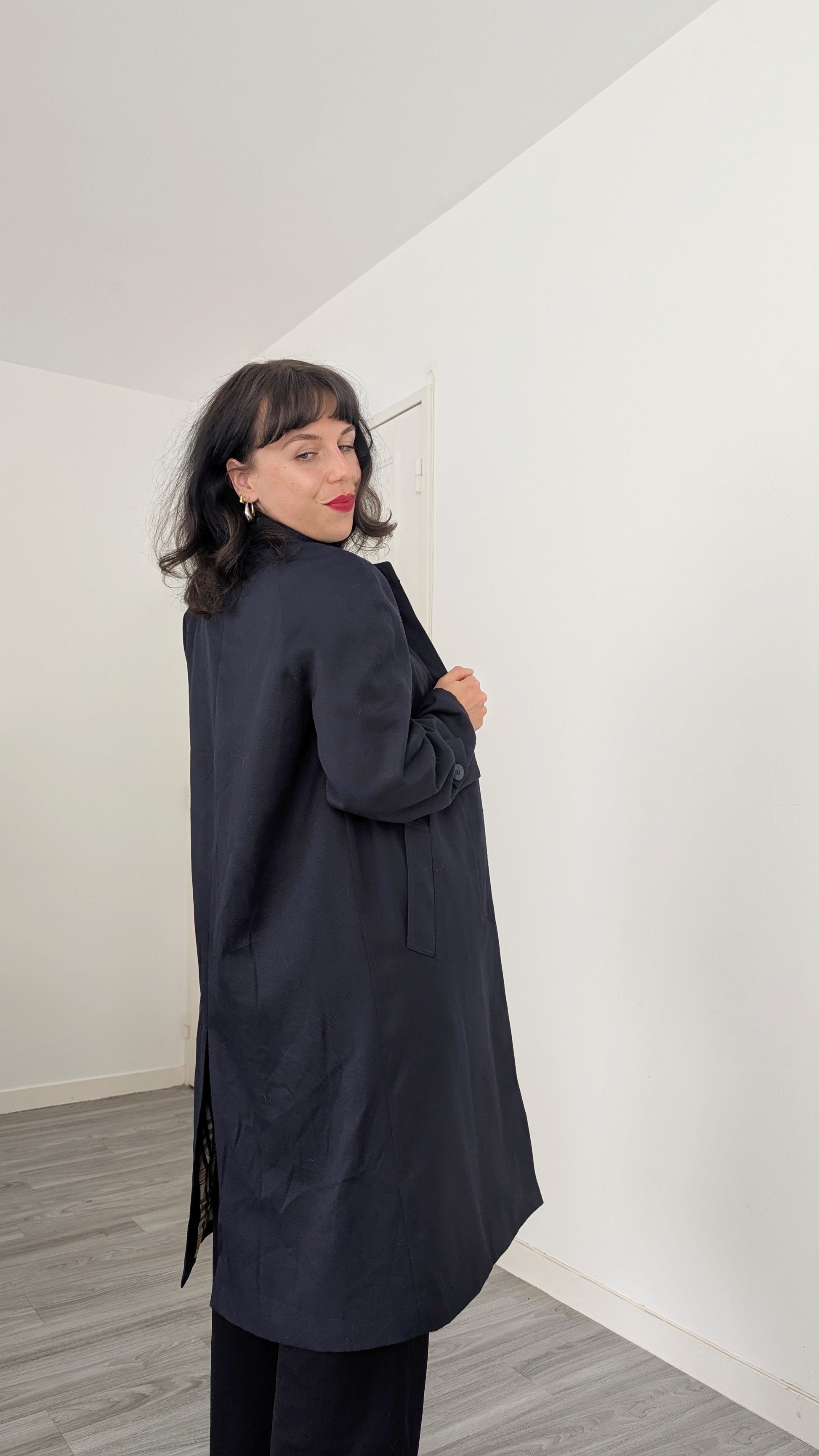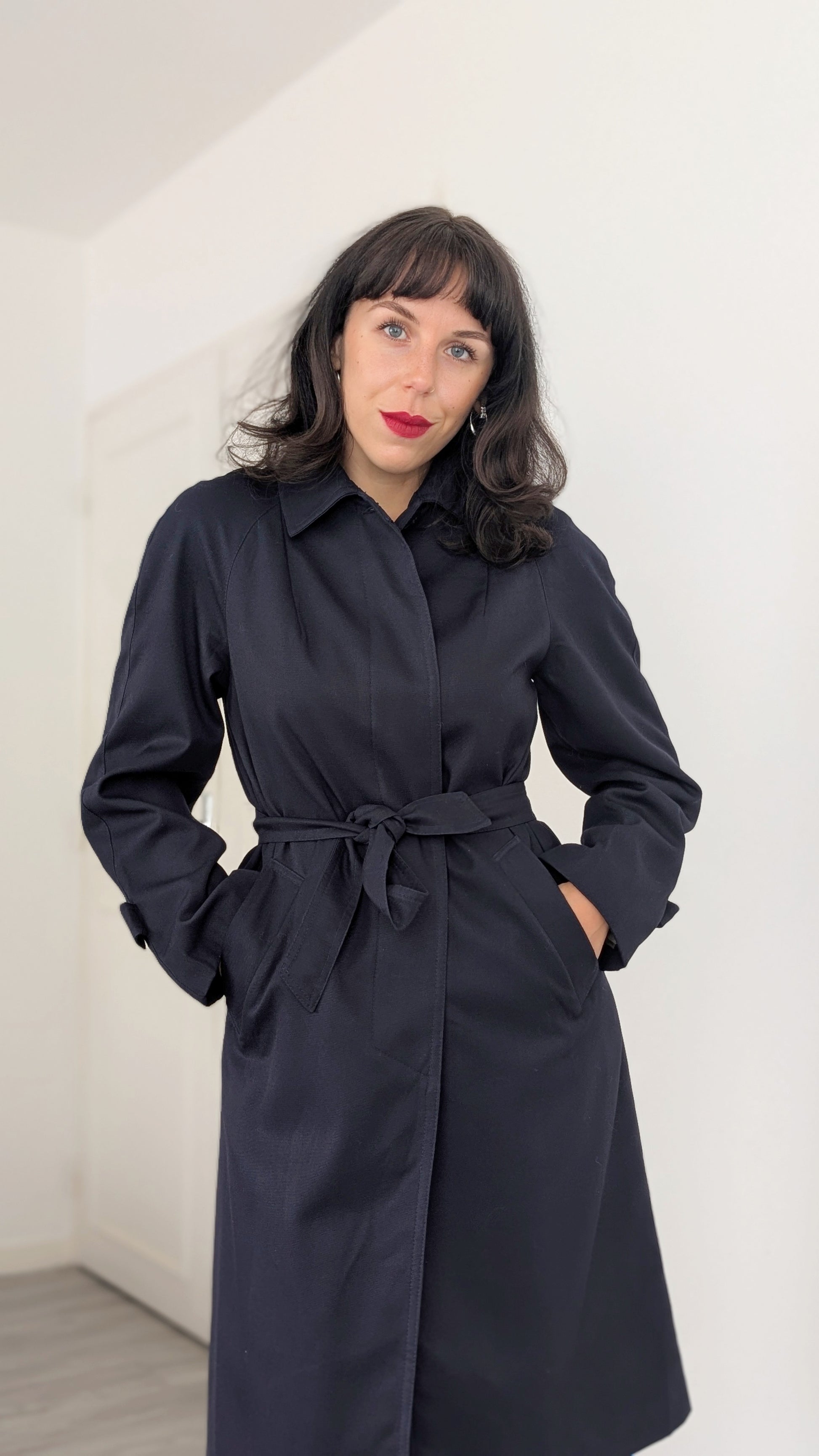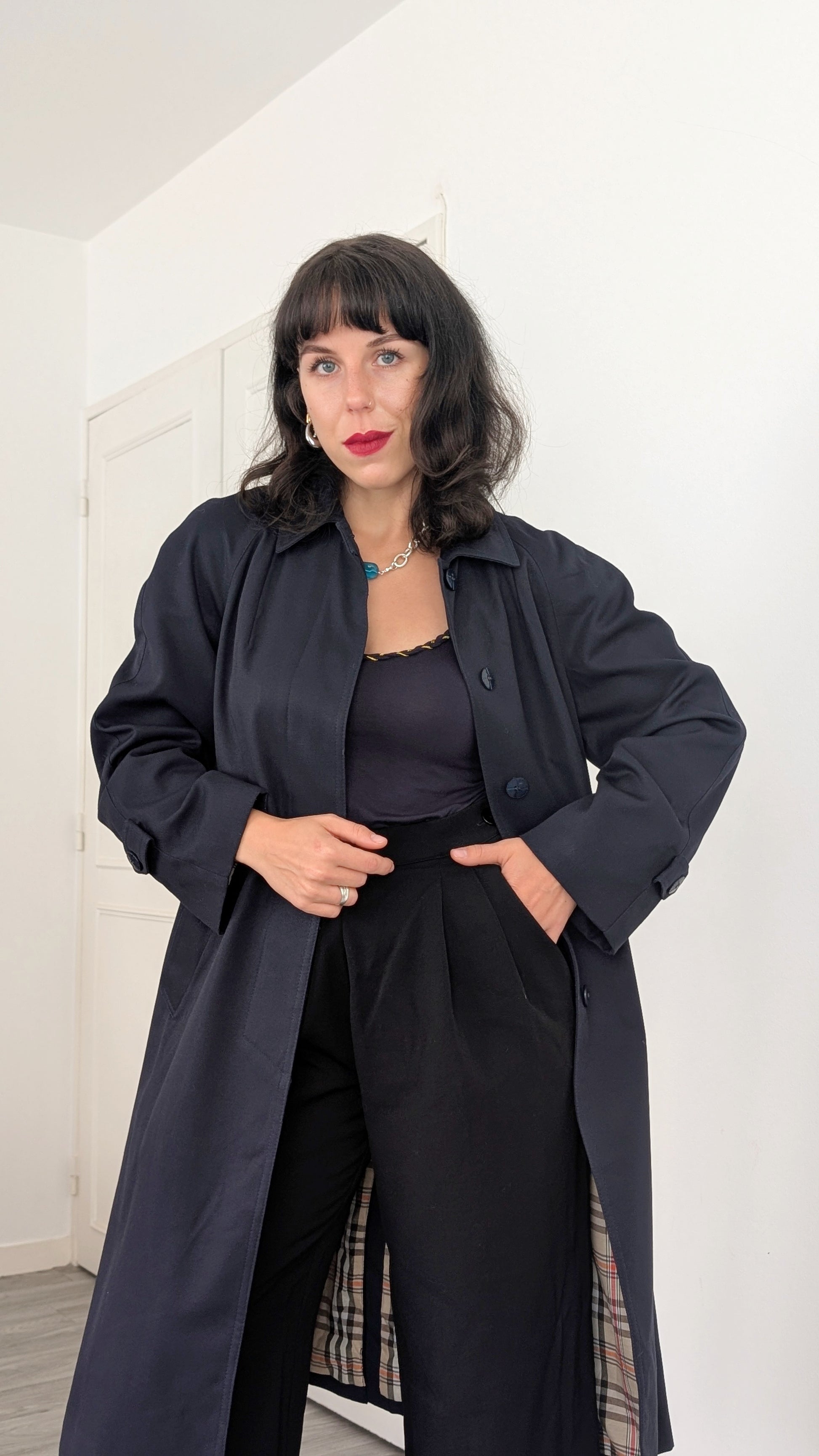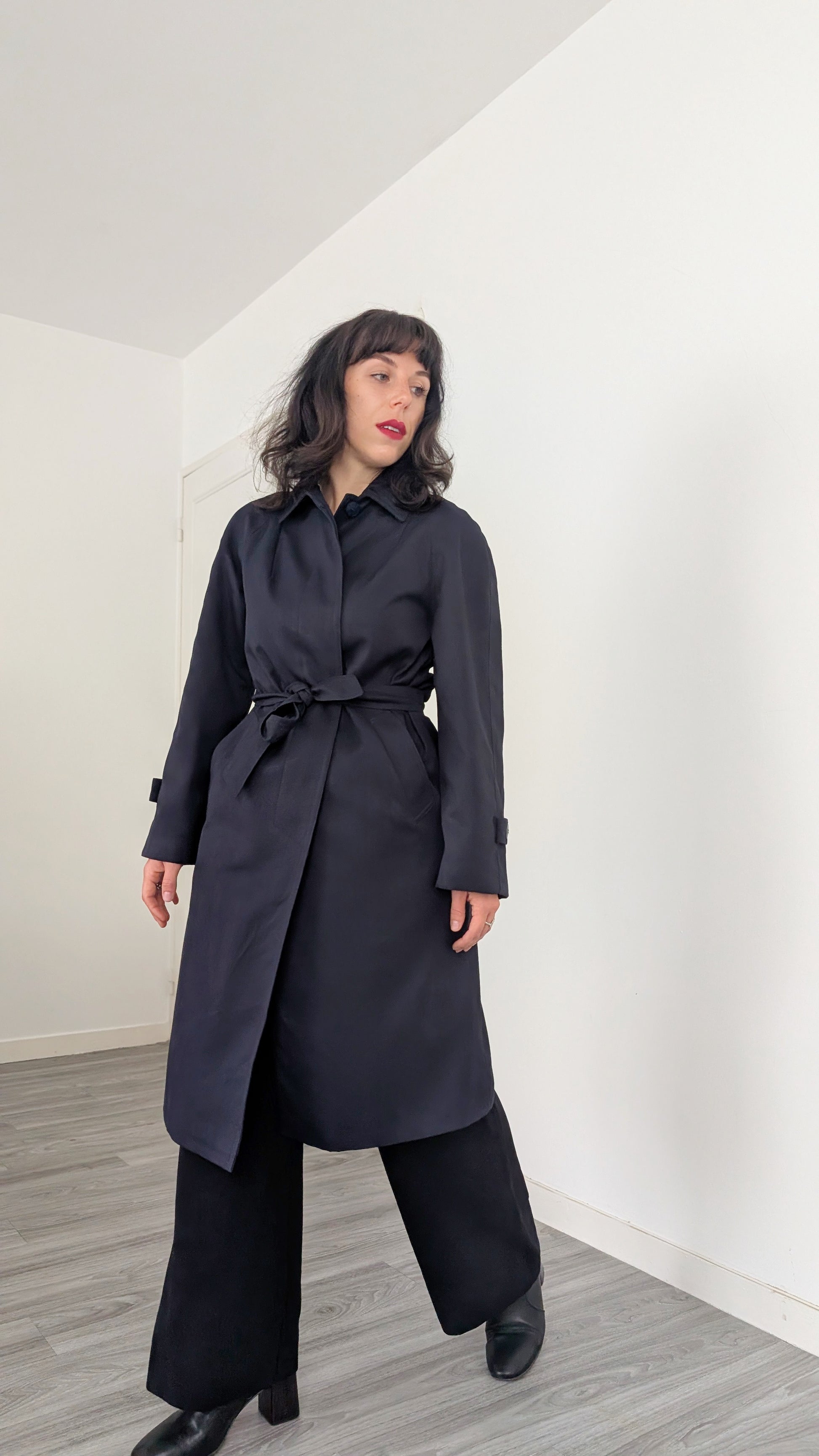 Détails : années 1980, fabriqué en France, très belle coupe avec des poches latérales et sa propre ceinture, les manches sont raglan, tombantes