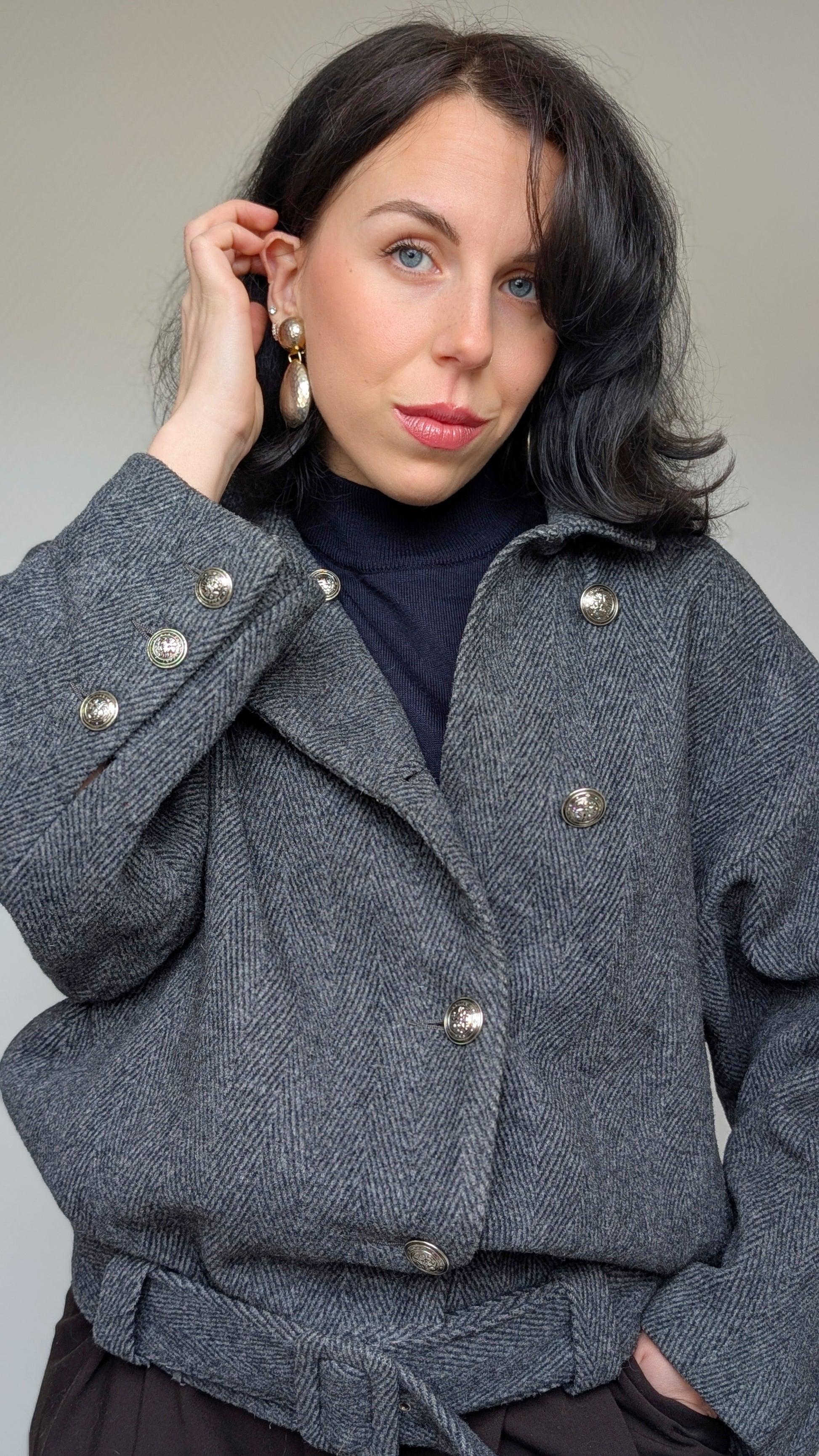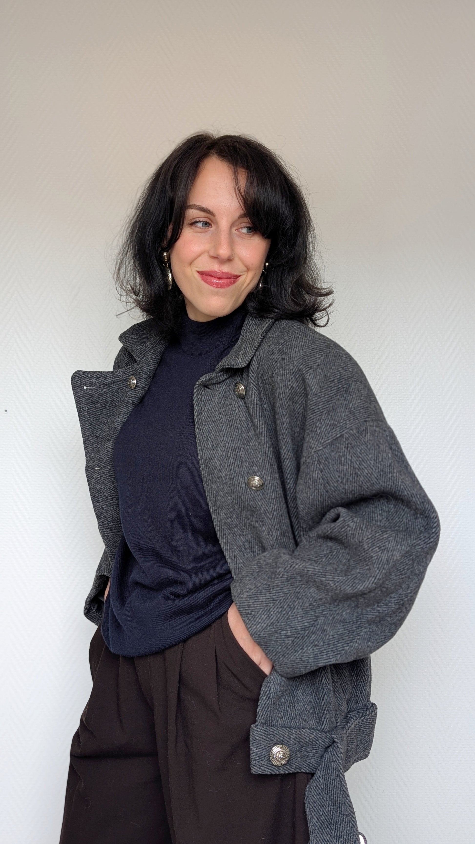 Détails : années 1980, coupe légèrement courte à porter avec des tailles hautes, boutons bijoux, manches chauvesouris, ample, très cocooning, attention aux bras longs les manches ne sont pas très longues