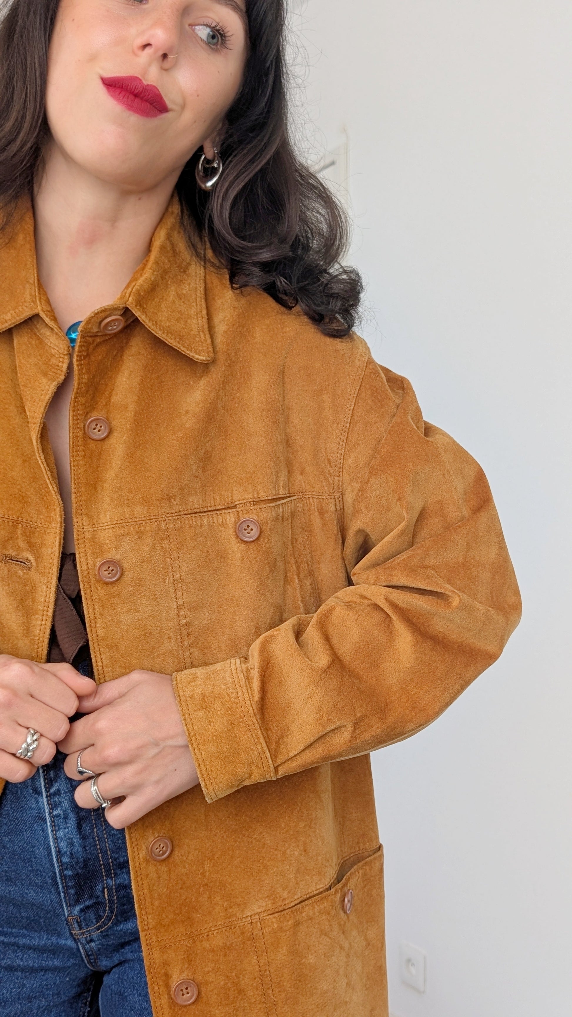 Détails : années 1980, très belle qualité, un daim doux, agréable à porter, doublé, poches latérales, possède un petit défaut à l'arrière de la veste en bas (voir photo)