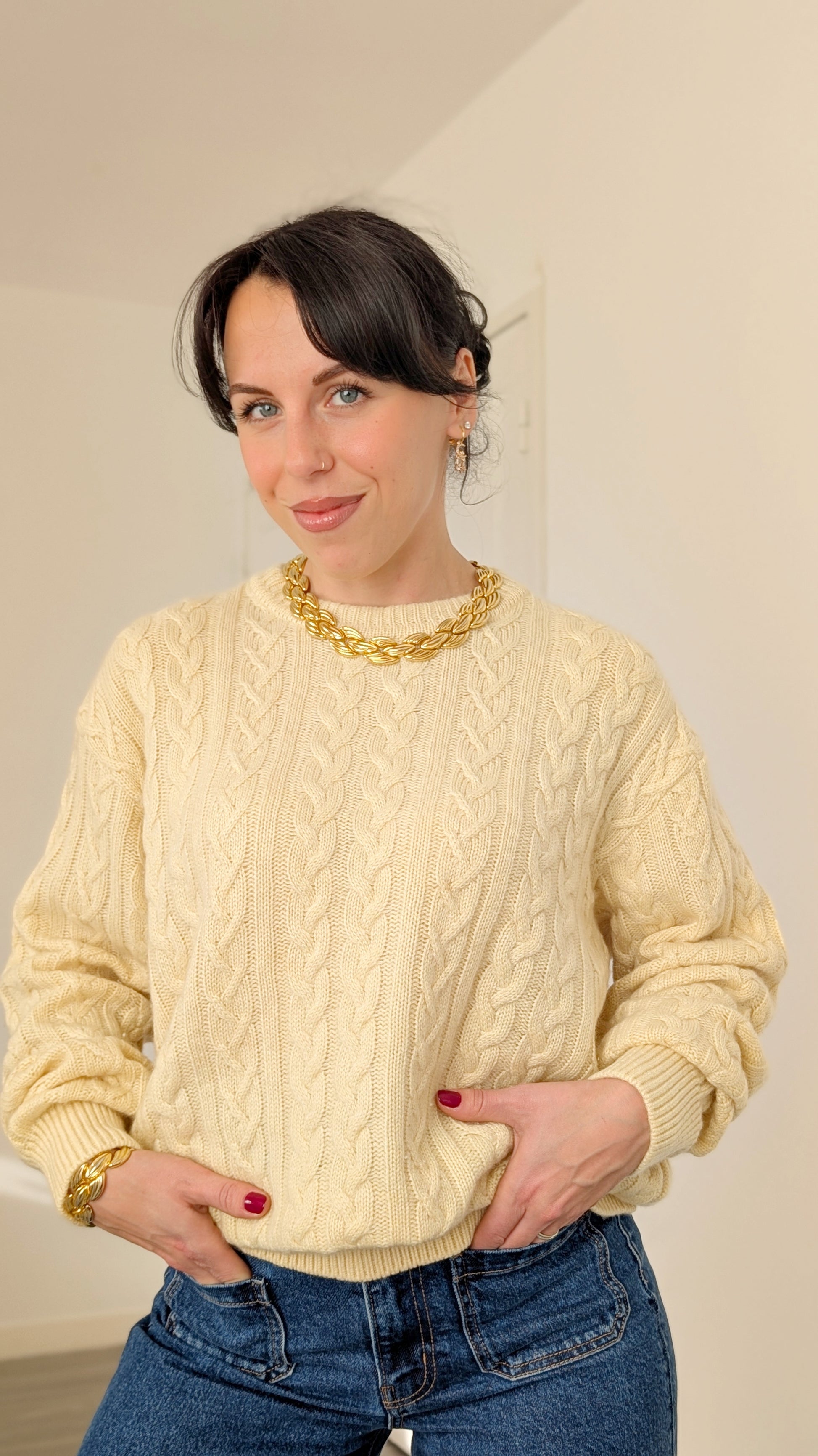 Détails : pull torsadé archi doux et agréable à porter, coupe classique, un peu ample