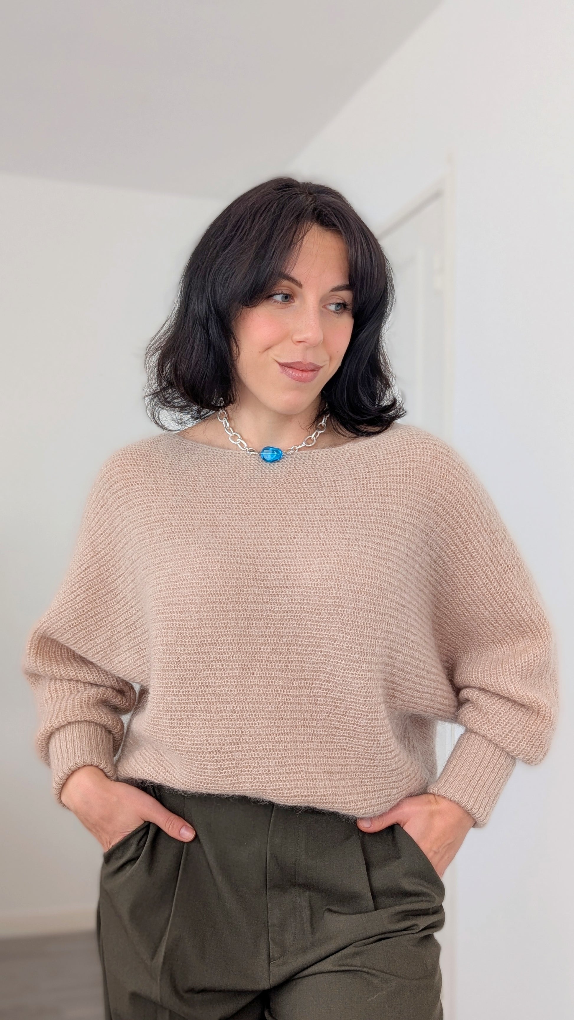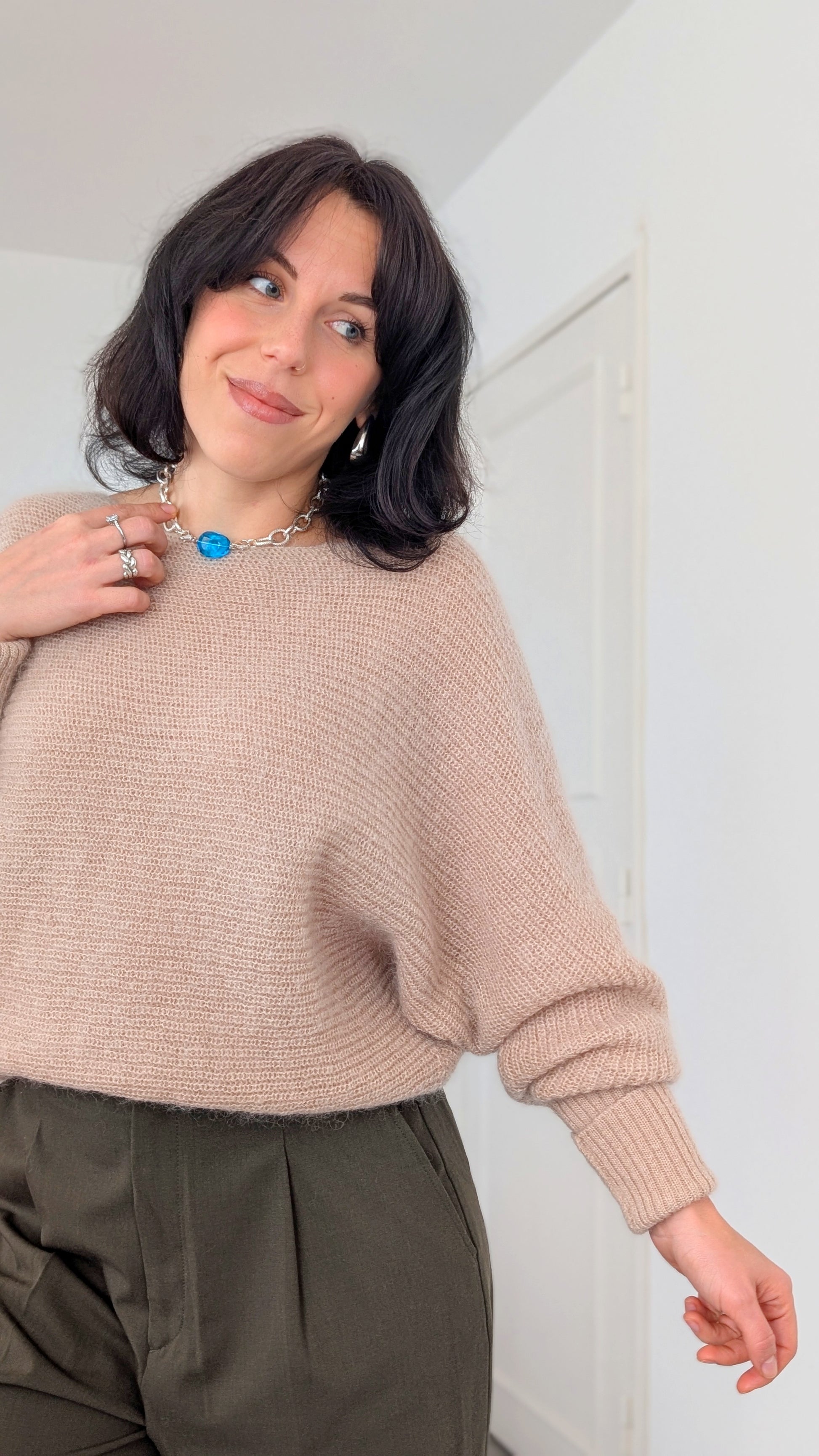 Détails : coupe légèrement courte, manches chauve-souris, matière douce et agréable à porter, coupe super intéressante qui va à plein de tailles différentes