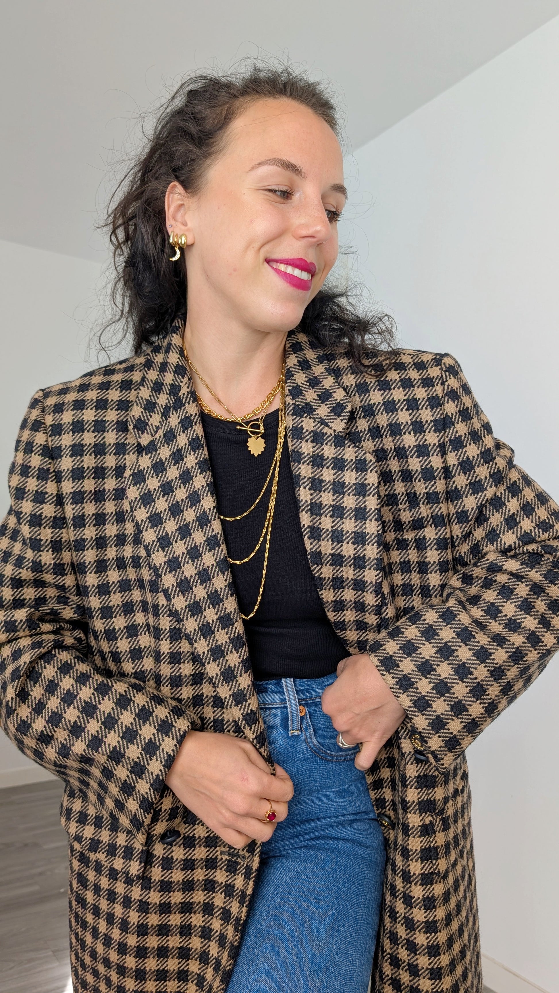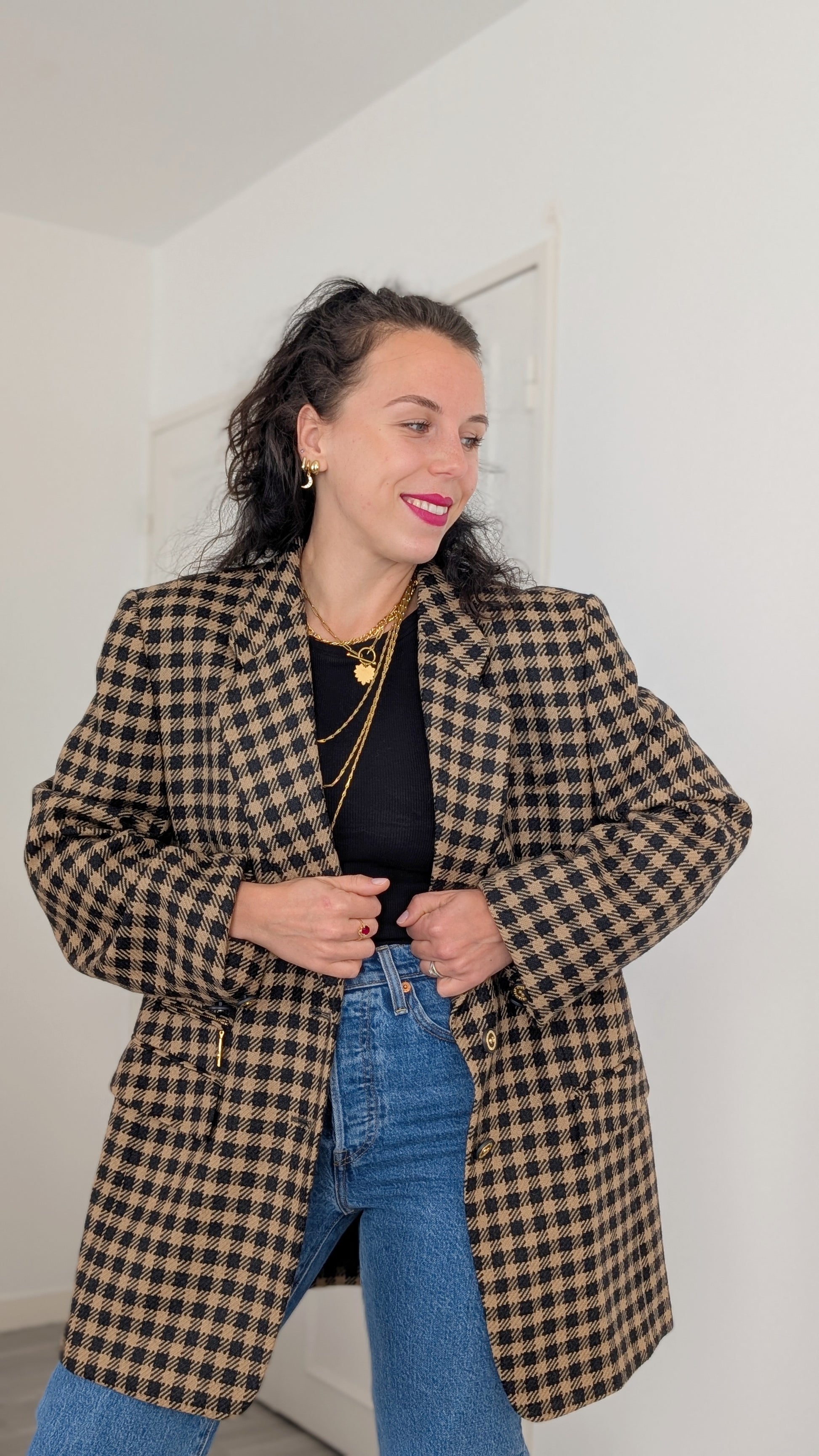 Détails : années 1980, superbe coupe et matière douce, poches latérales et boutons bijoux, il me va beaucoup trop grand sur les photos