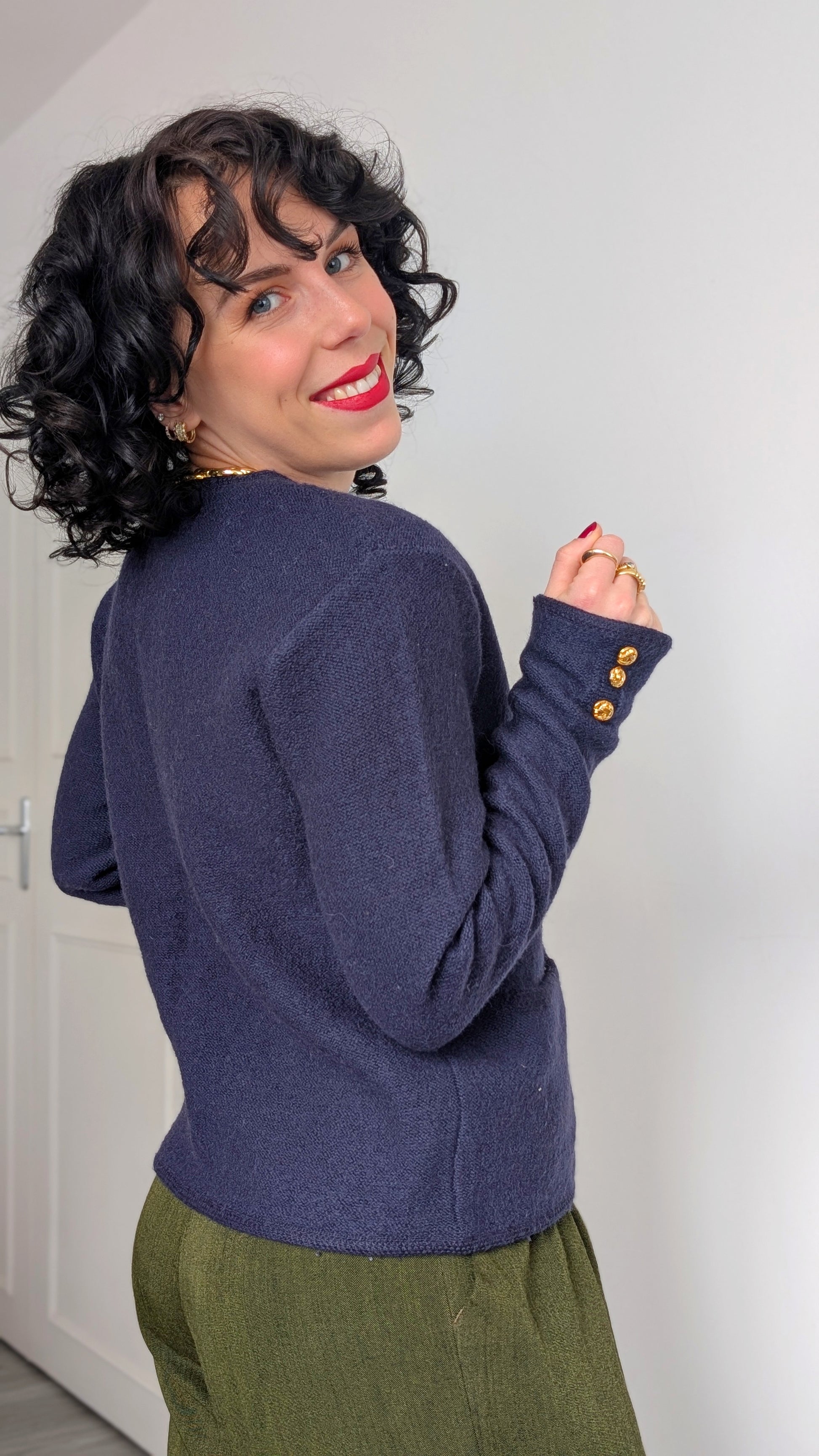 Détails : années 1980, coupe classique, boutonné sur le devant, boutons bijoux, laine douce