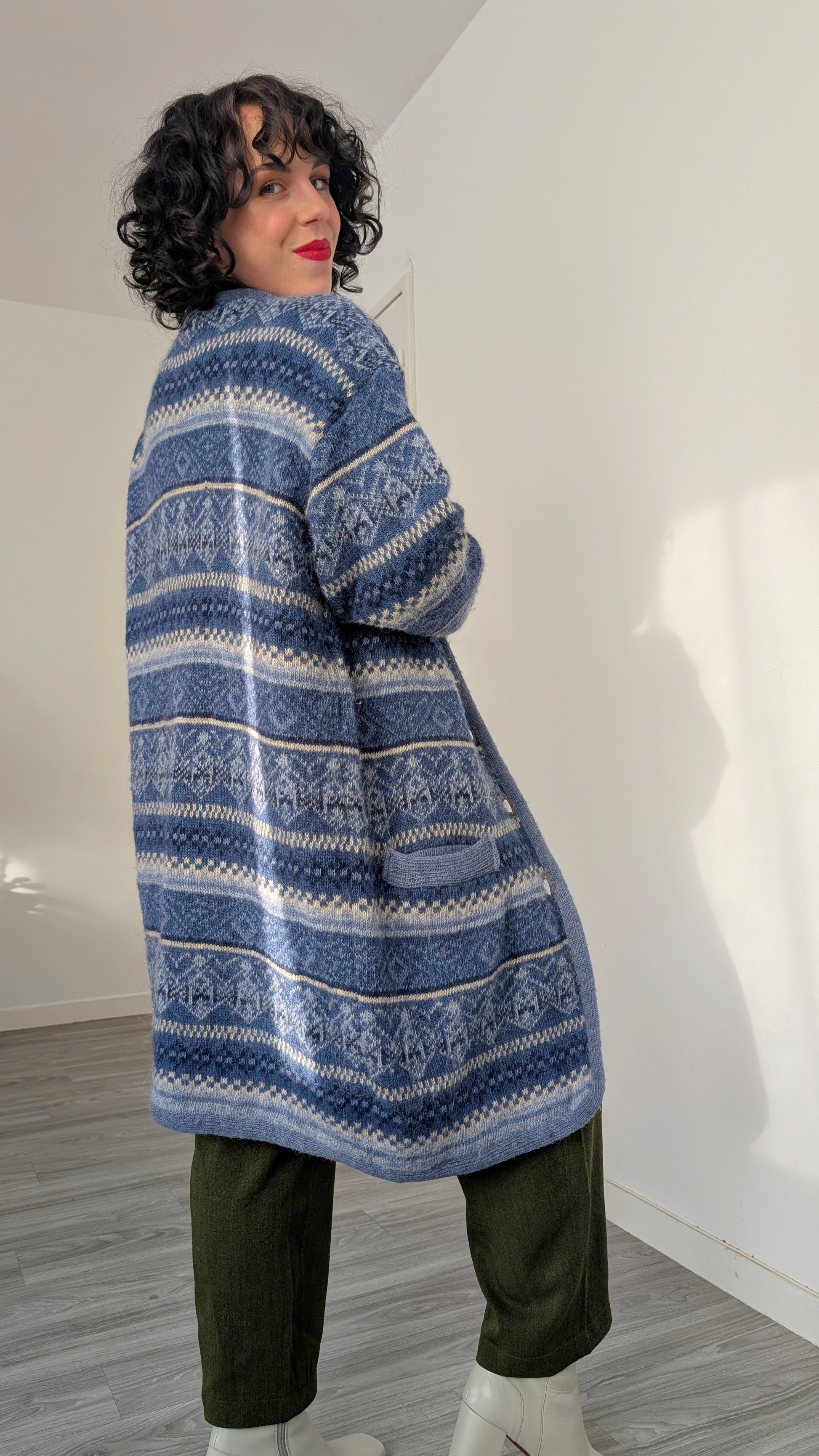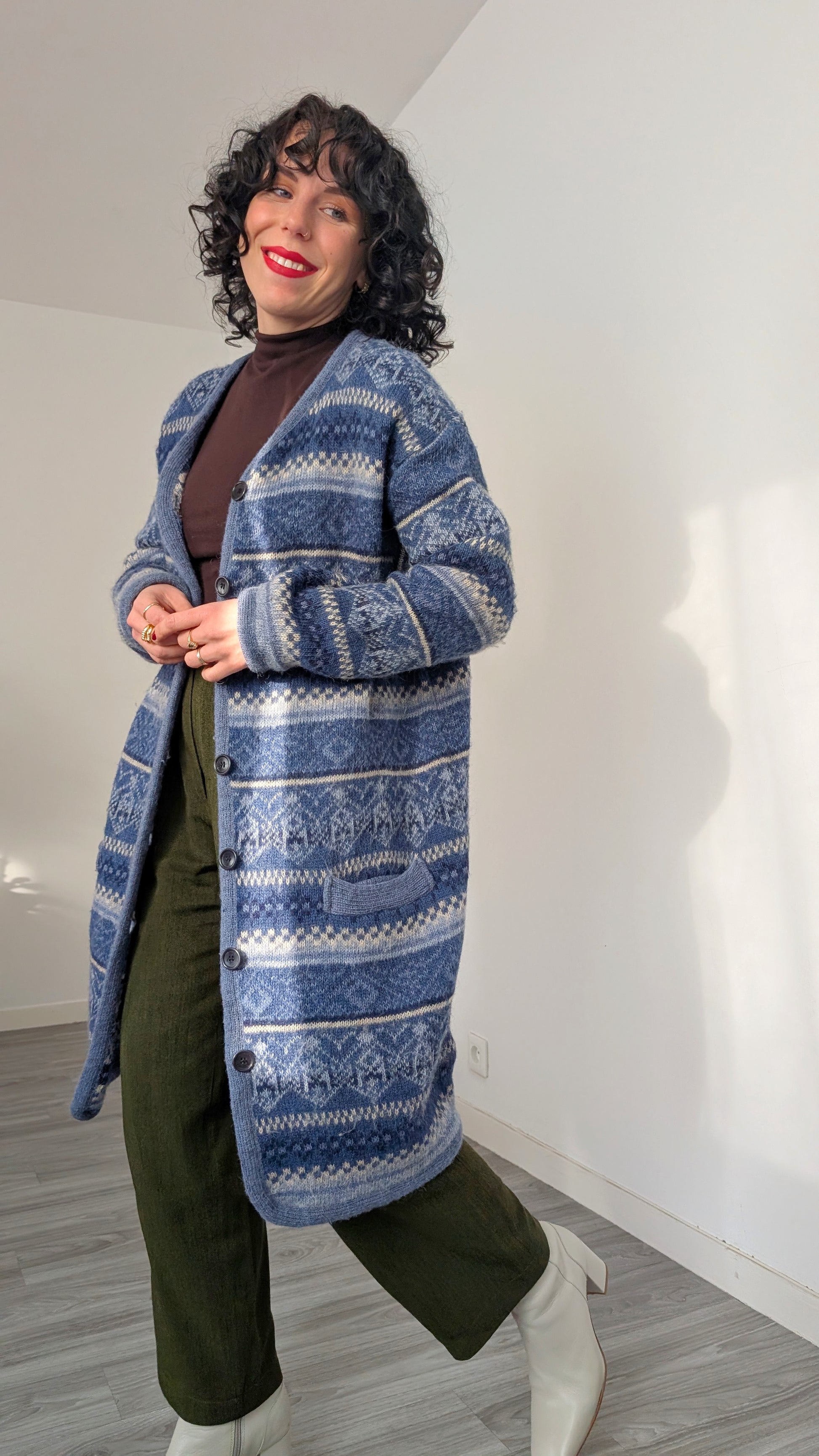 Détails : années 1980, très belle qualité, boutonné sur le devant, coupe longue