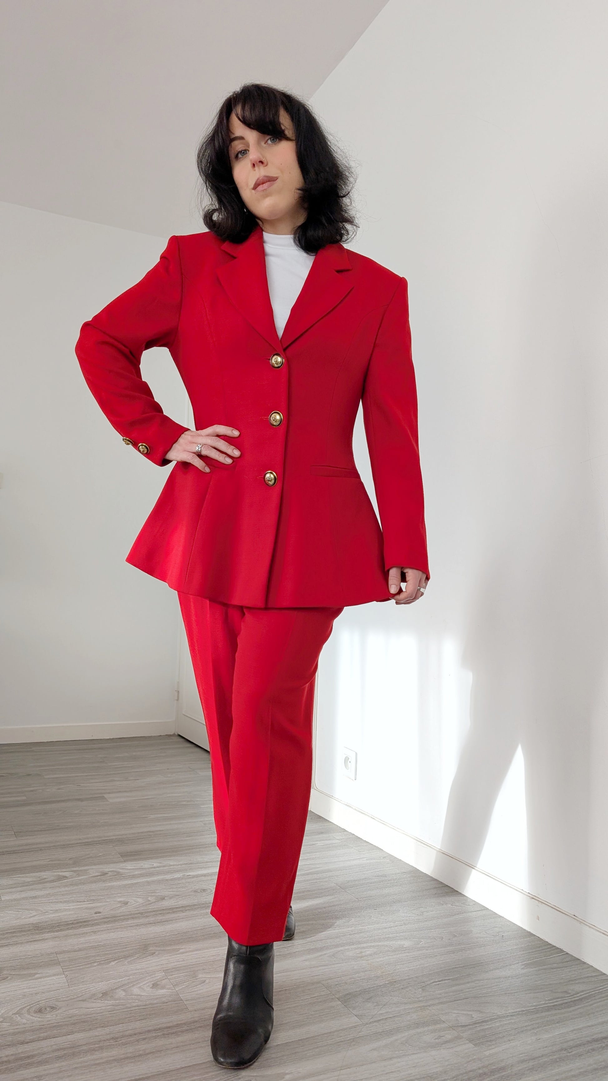 Détails : années 1980, fabrication italienne, superbe coupe blazer structuré, pantalon taille haute, superbe qualité et matière, boutons bijoux, possède quelques mini traces très peu visibles, une en haut du pantalon et une sur le blazer (voir photos)