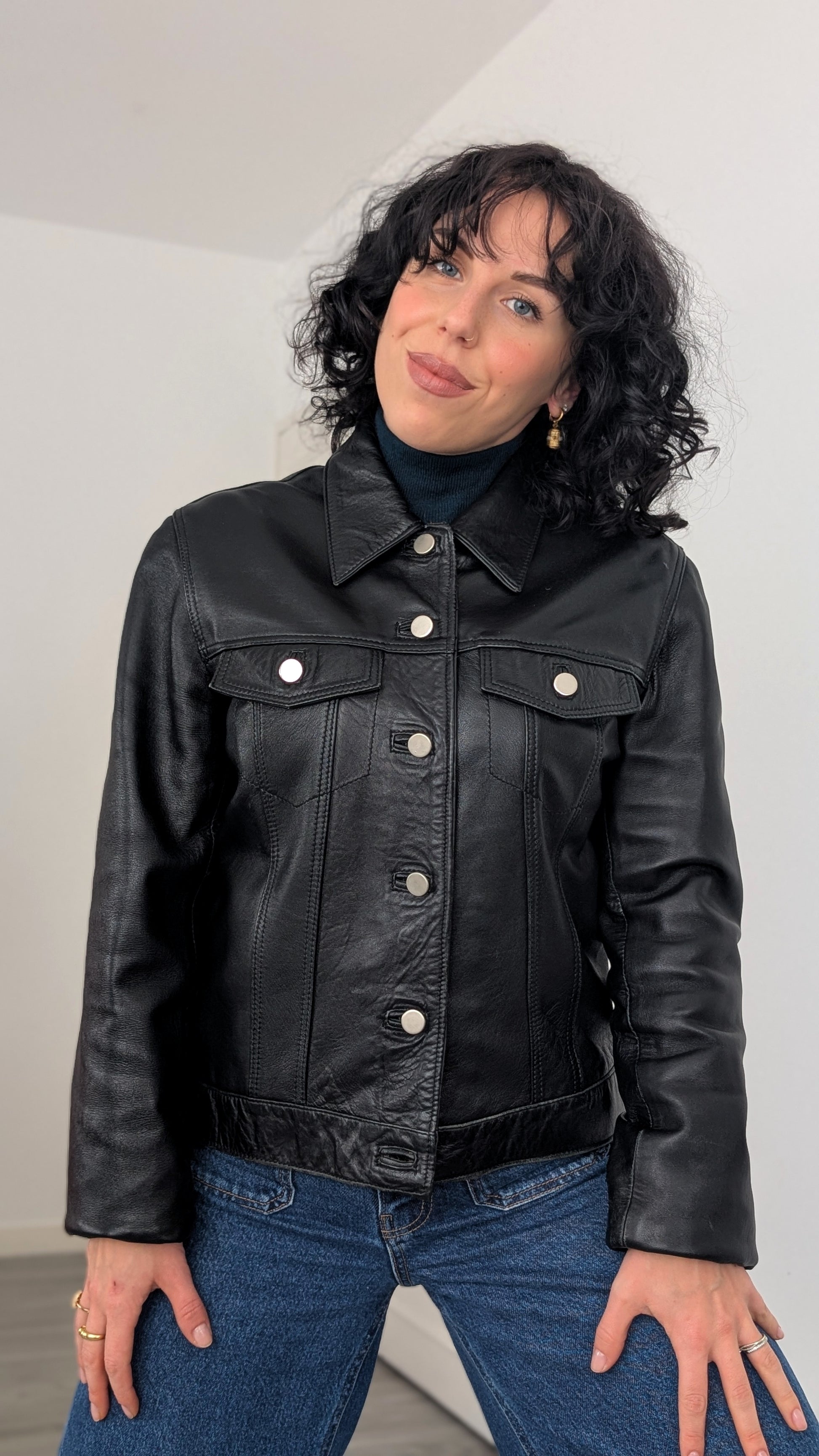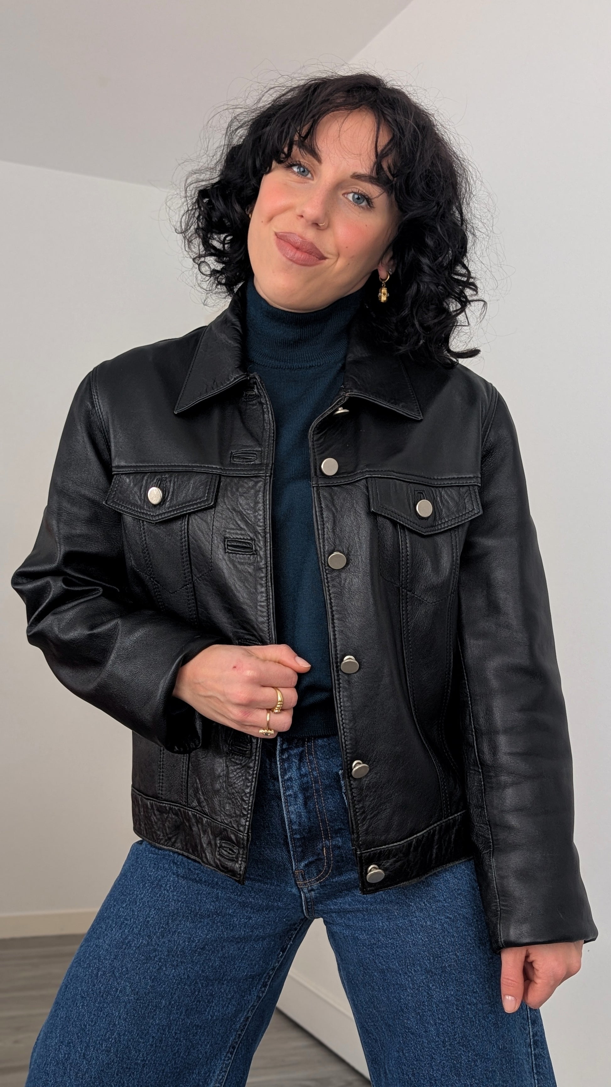 Détails : années 90, cuir souple, de très belle qualité, coupe légèrement courte à porter avec des tailles hautes, état impeccable, à porter en layering cet hiver avec une veste par dessous