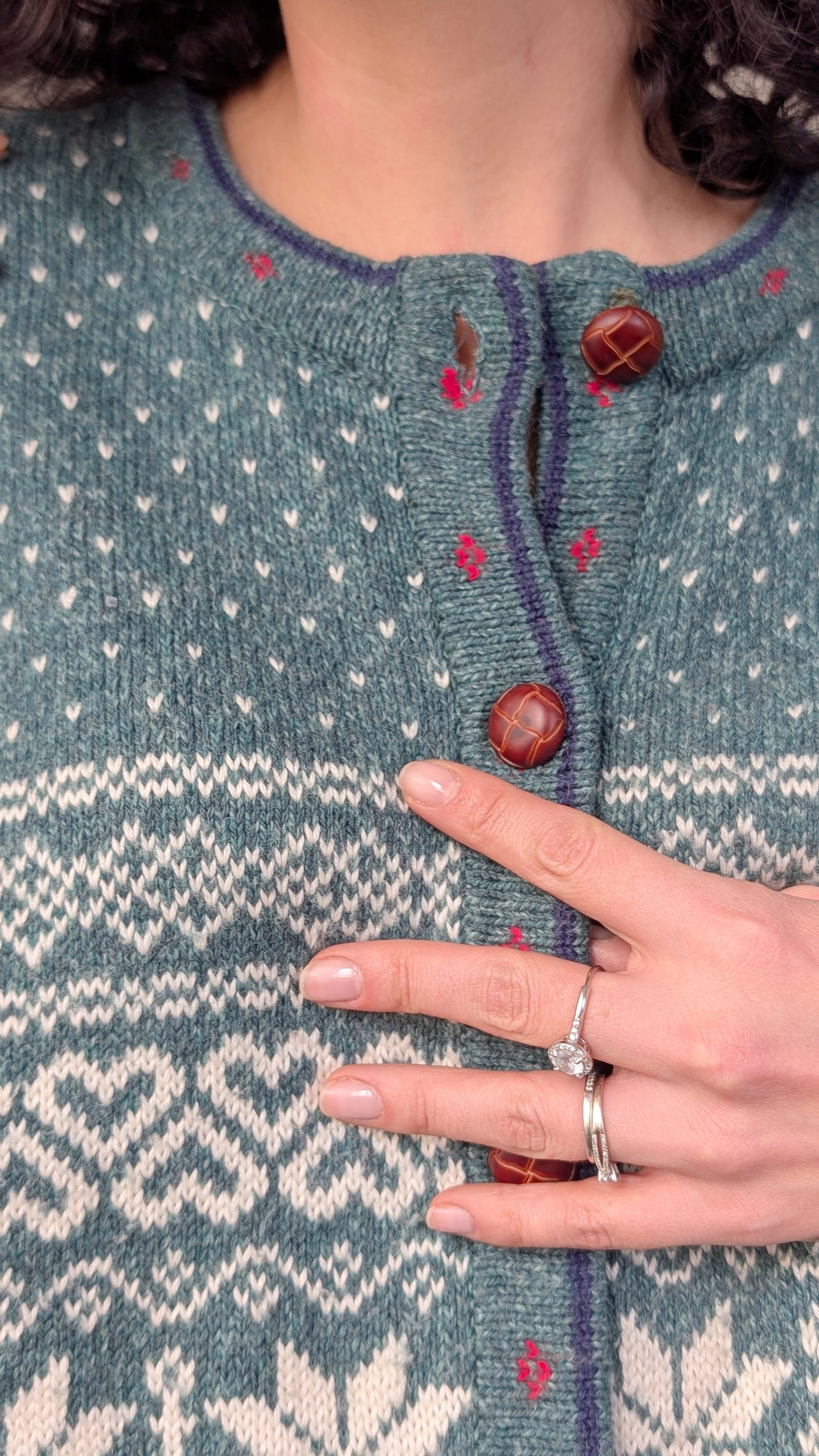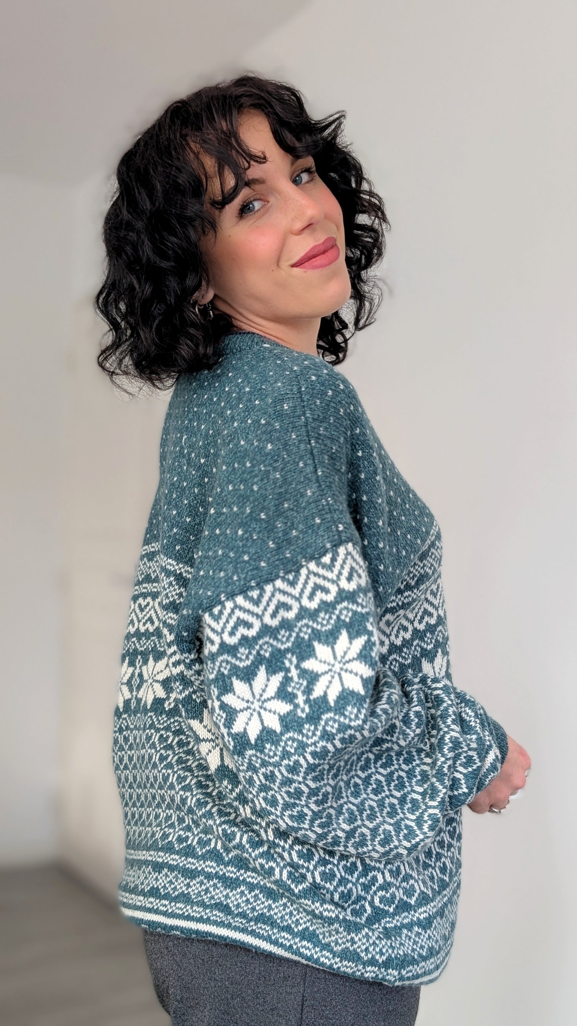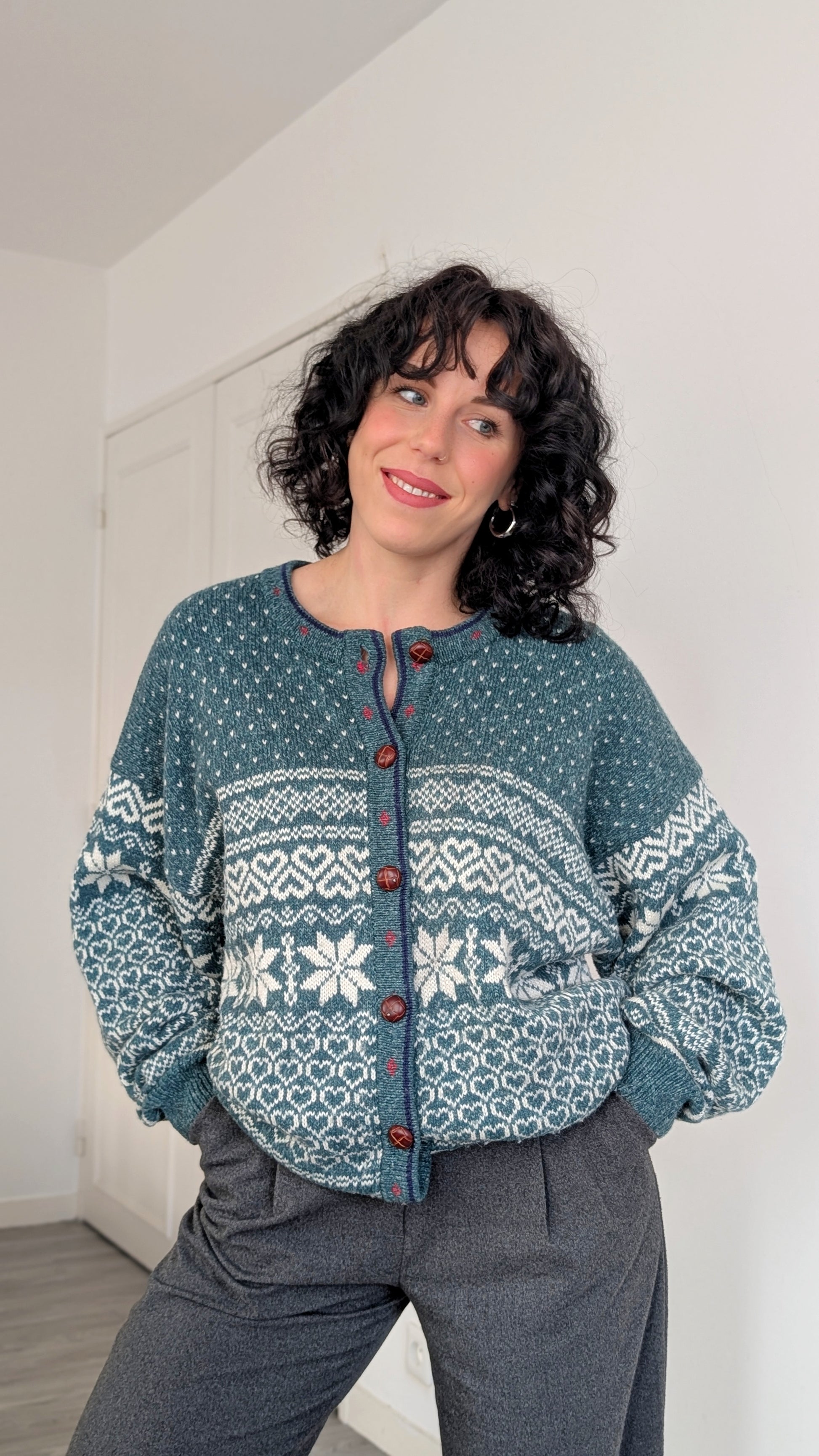 Détails : années 1980, pull d'hiver archi cocooning, ample, boutonné sur le devant