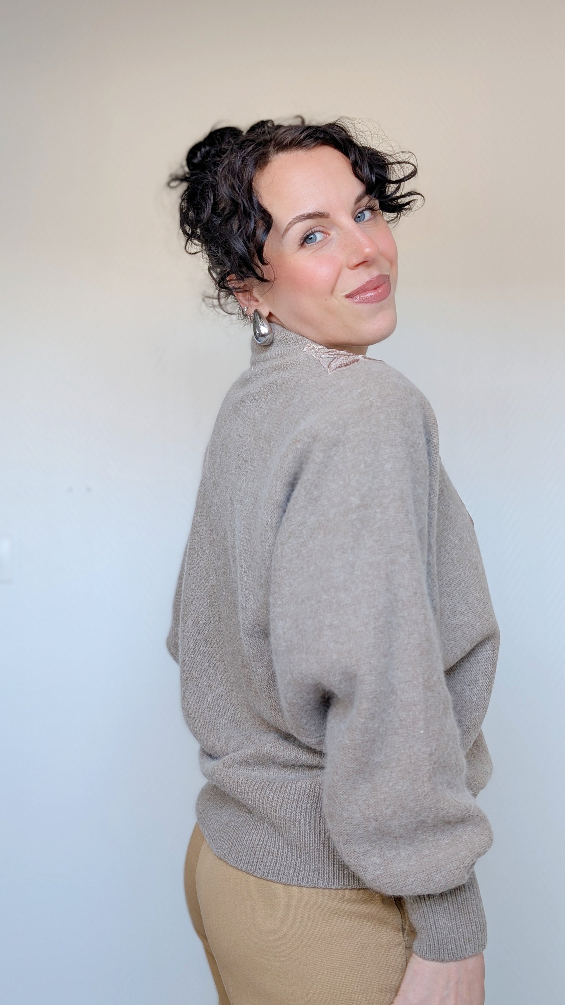 Détails : années 1980, col montant, manches chauve-souris, matière super douce