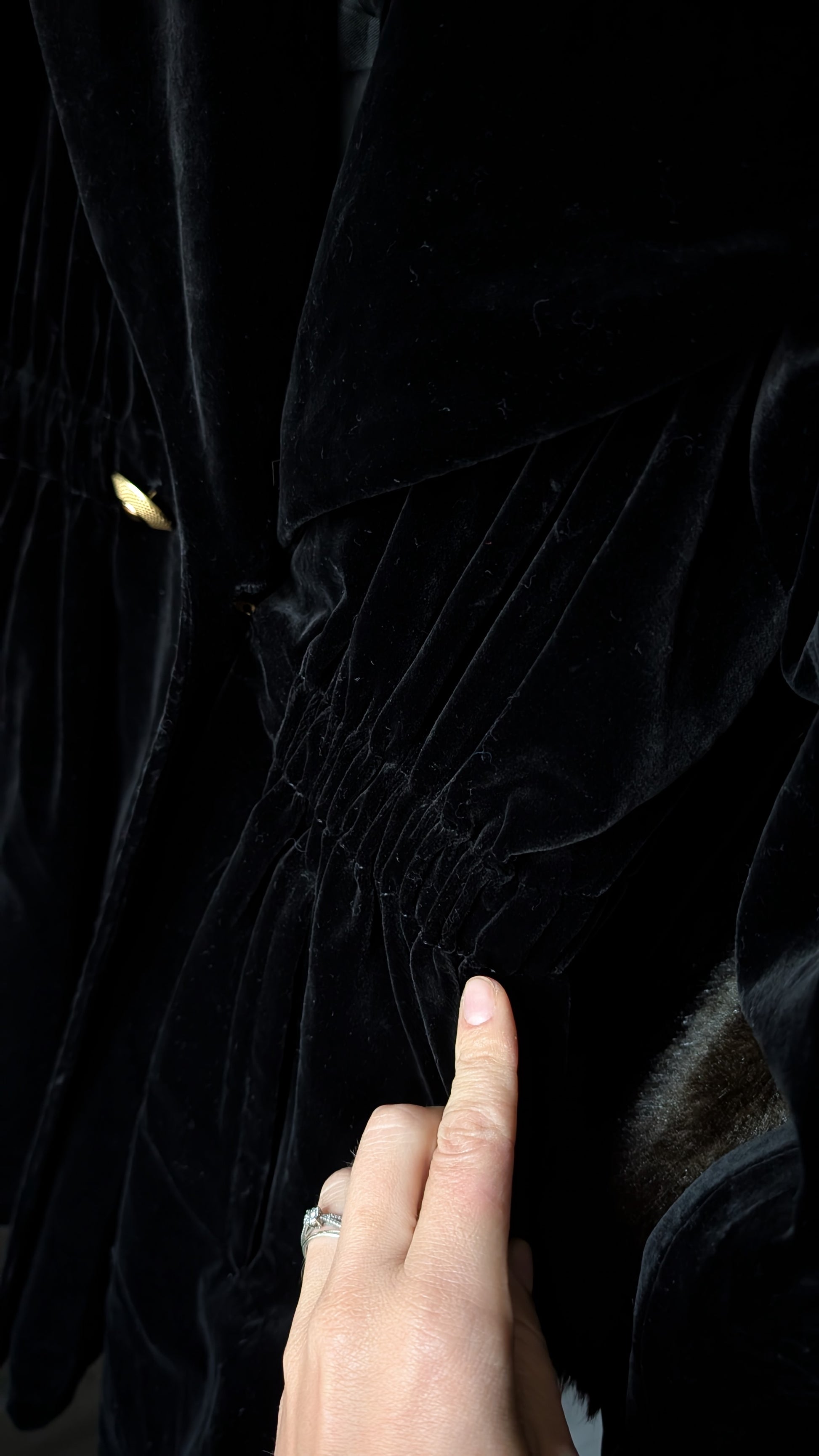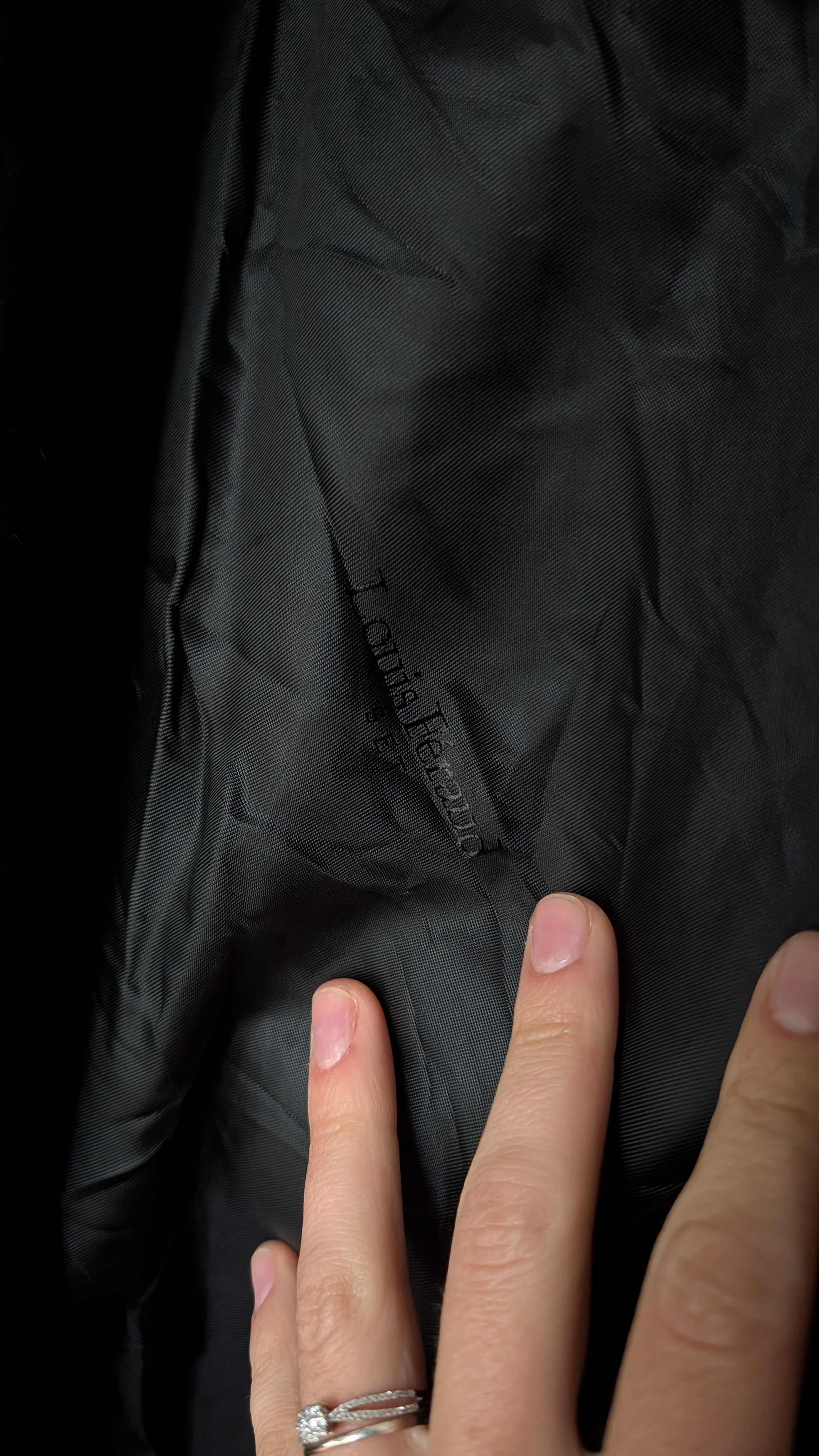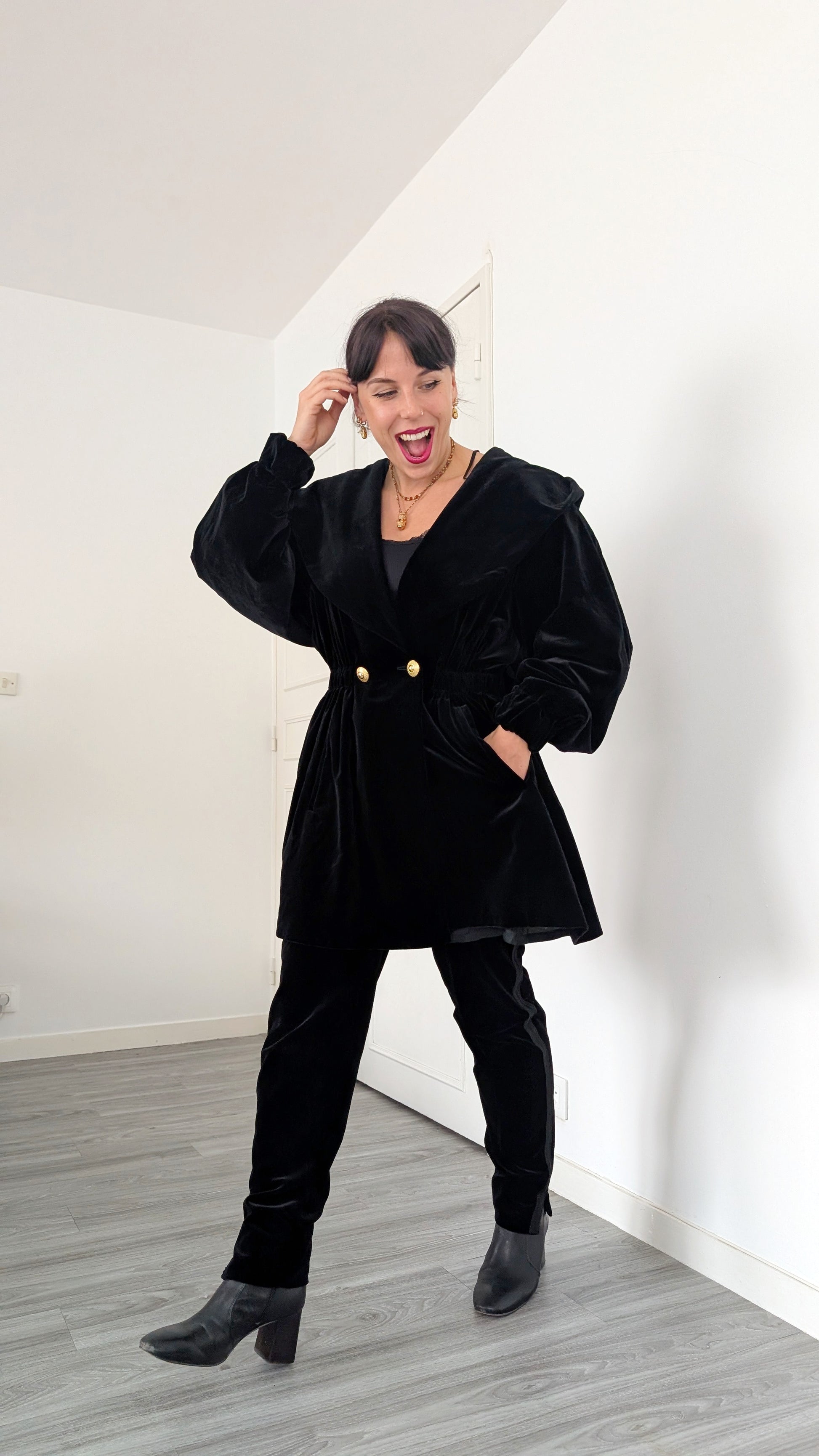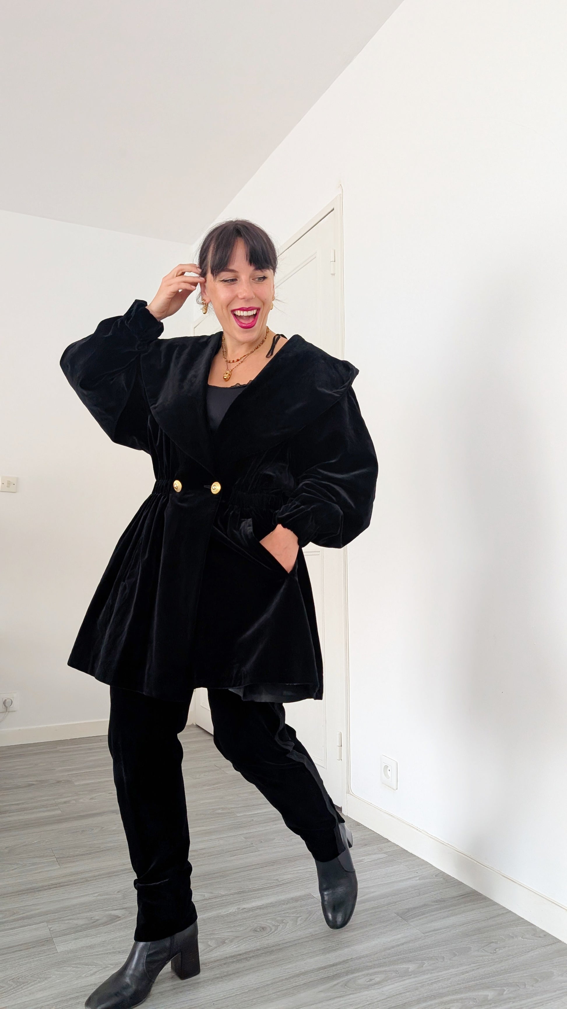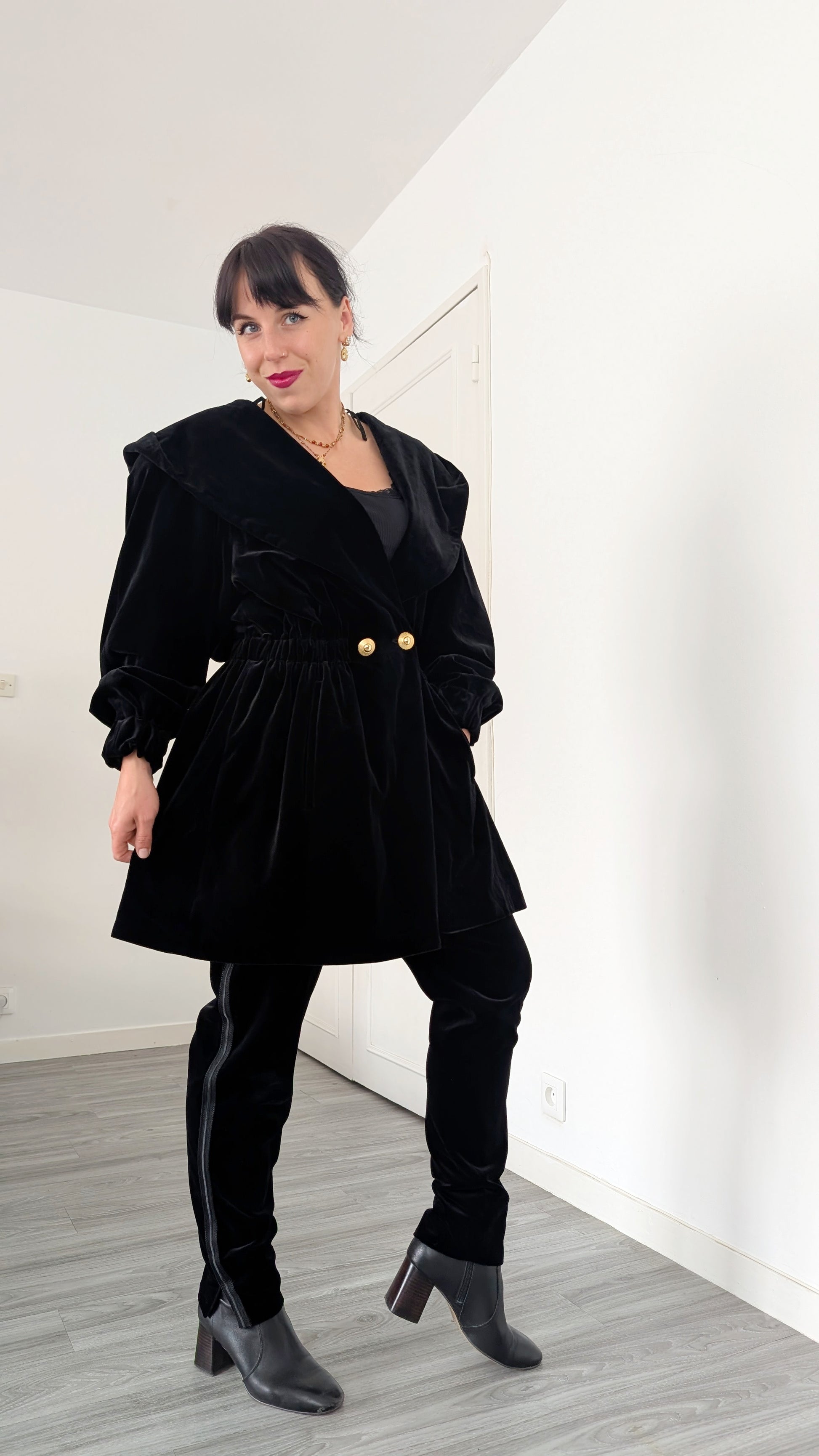 Mensurations : veste aisselles/buste 50 cm, longueur 89 cm, épaules 47 cm, longueur manches 65 cm