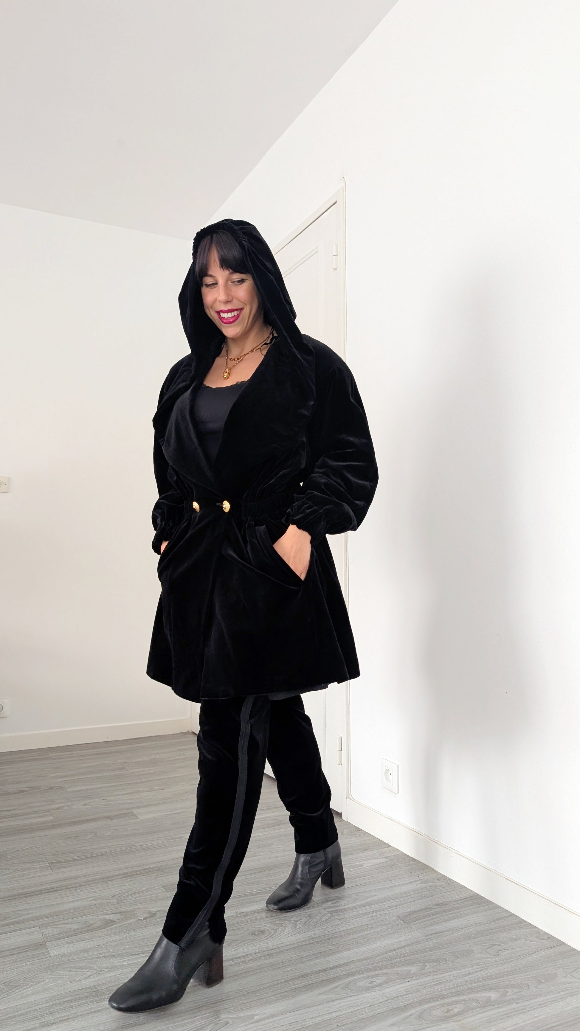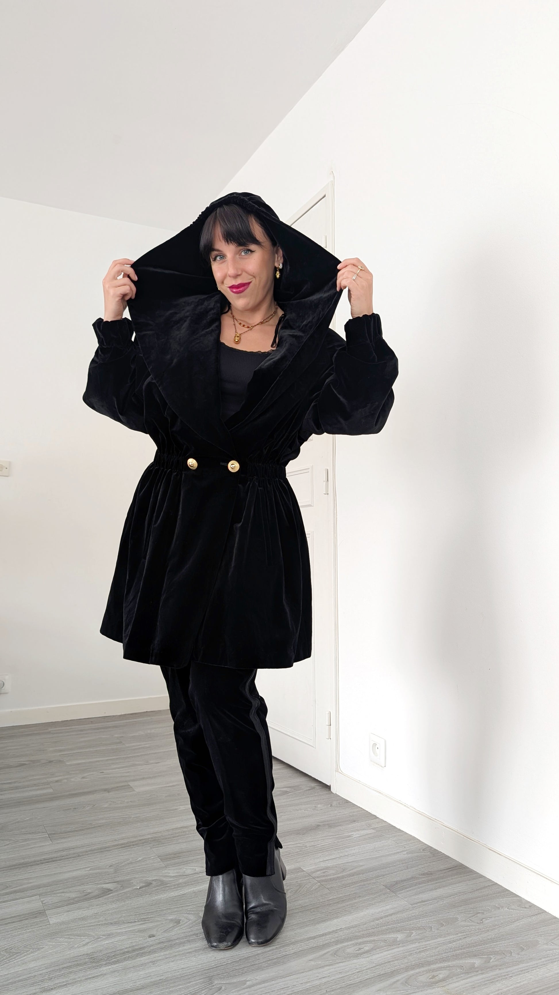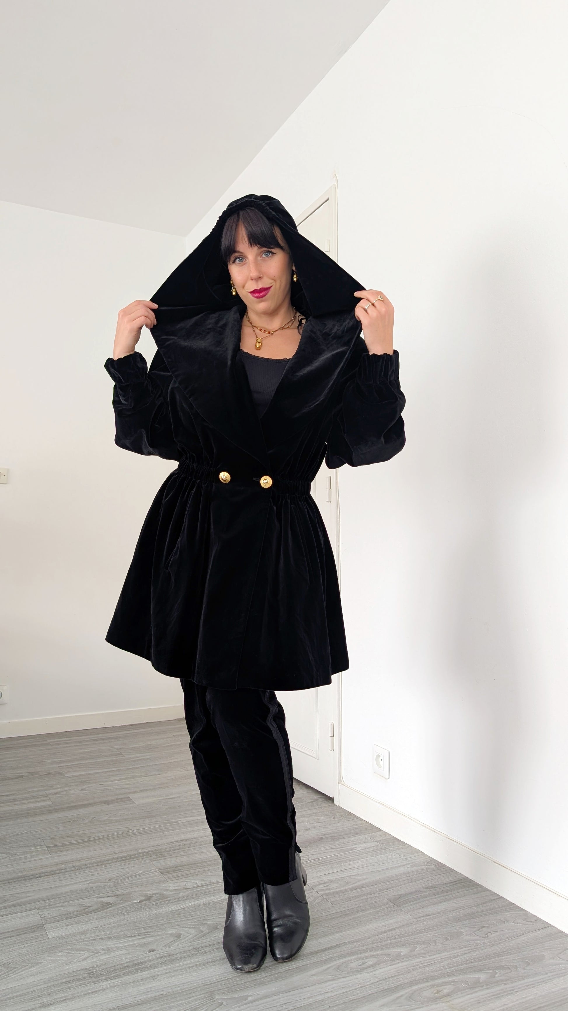 Détails : années 1980, ensemble rare de la marque de luxe Louis Féraud, superbe qualité, pantalon taille haute avec une broderie sur les côtés, veste un peu plus oversize légèrement ajustée à la taille, boutons bijoux, capuche, matière extrêmement douce, doublé, excellent état
