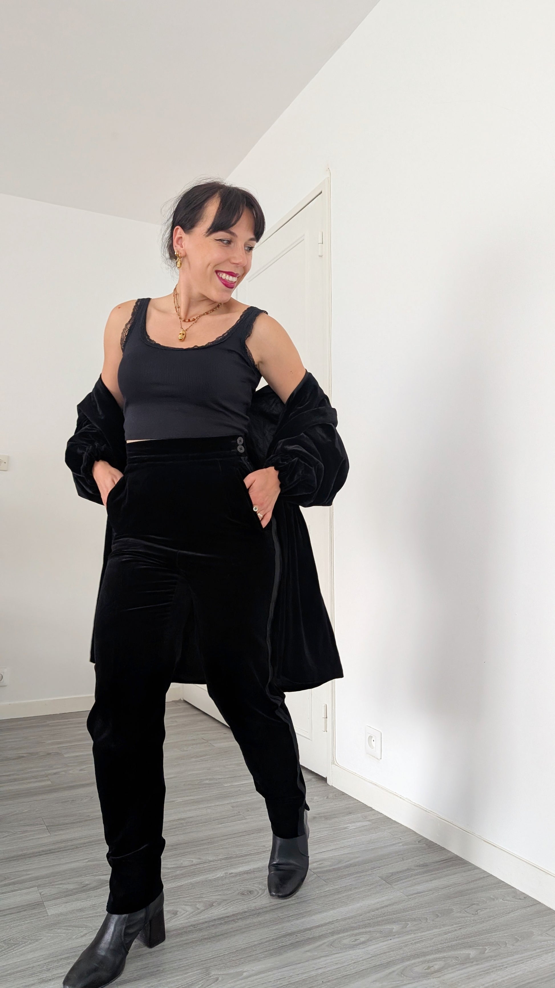 pantalon taille à plat 35 cm, longueur 104 cm, hanches 52 cm, fourche 37 cm