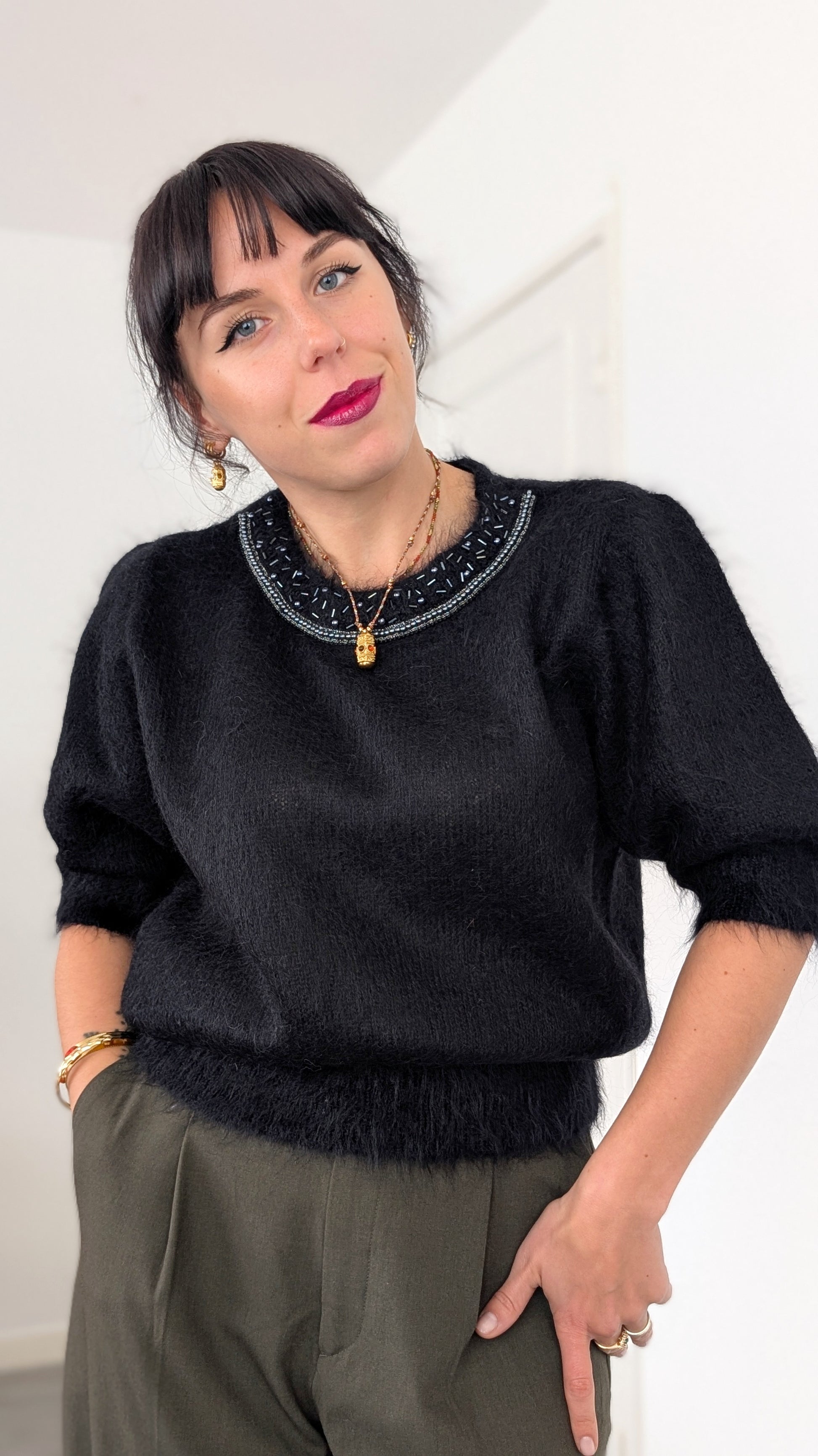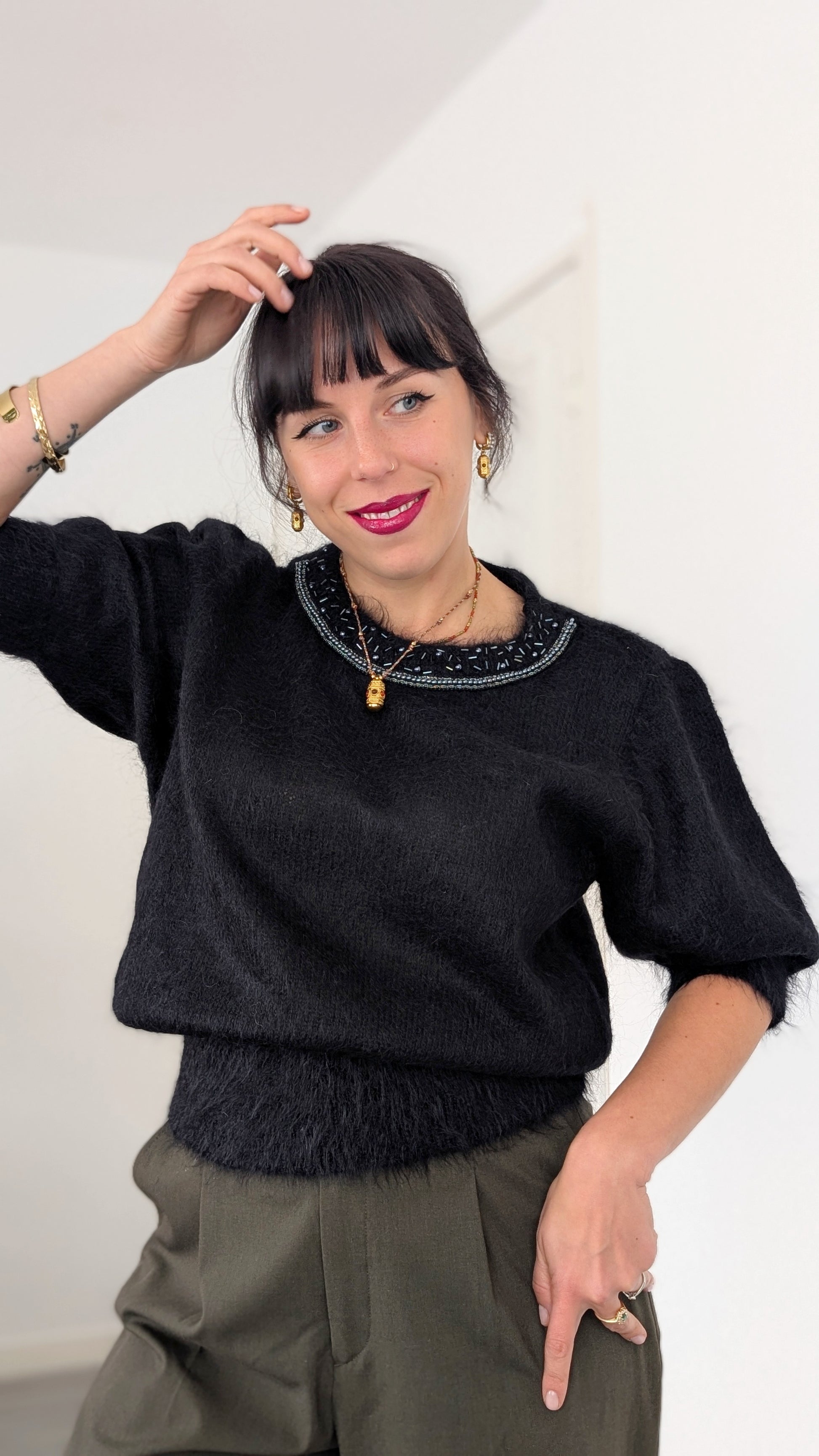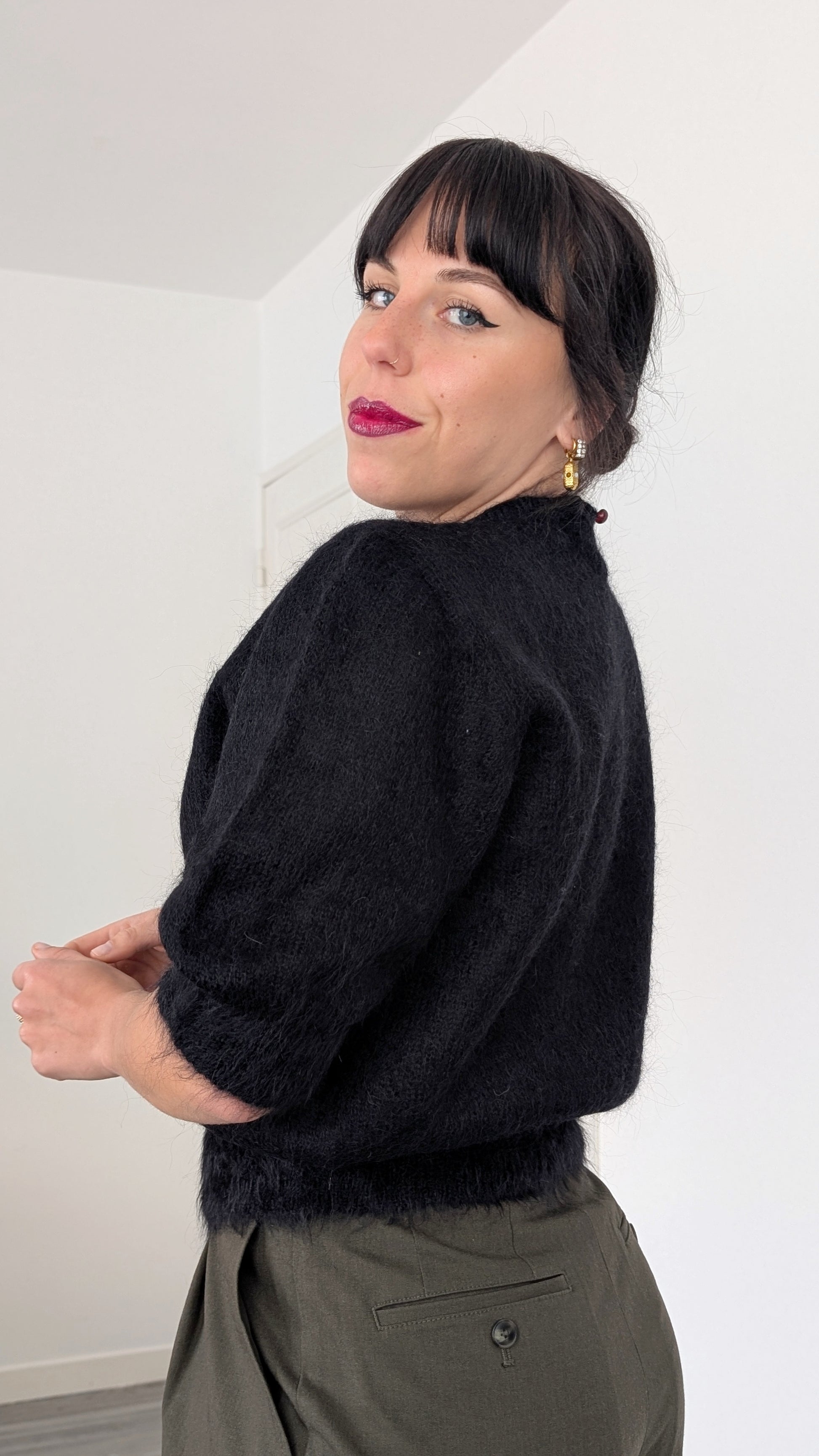 Détails : années 1980, superbe coupe et détails, la coupe est légèrement plus ajustée en bas, de mon côté je ne trouve pas qu'il gratte mais attention si vous avez la peau archi sensible, vous allez sentir le mohair