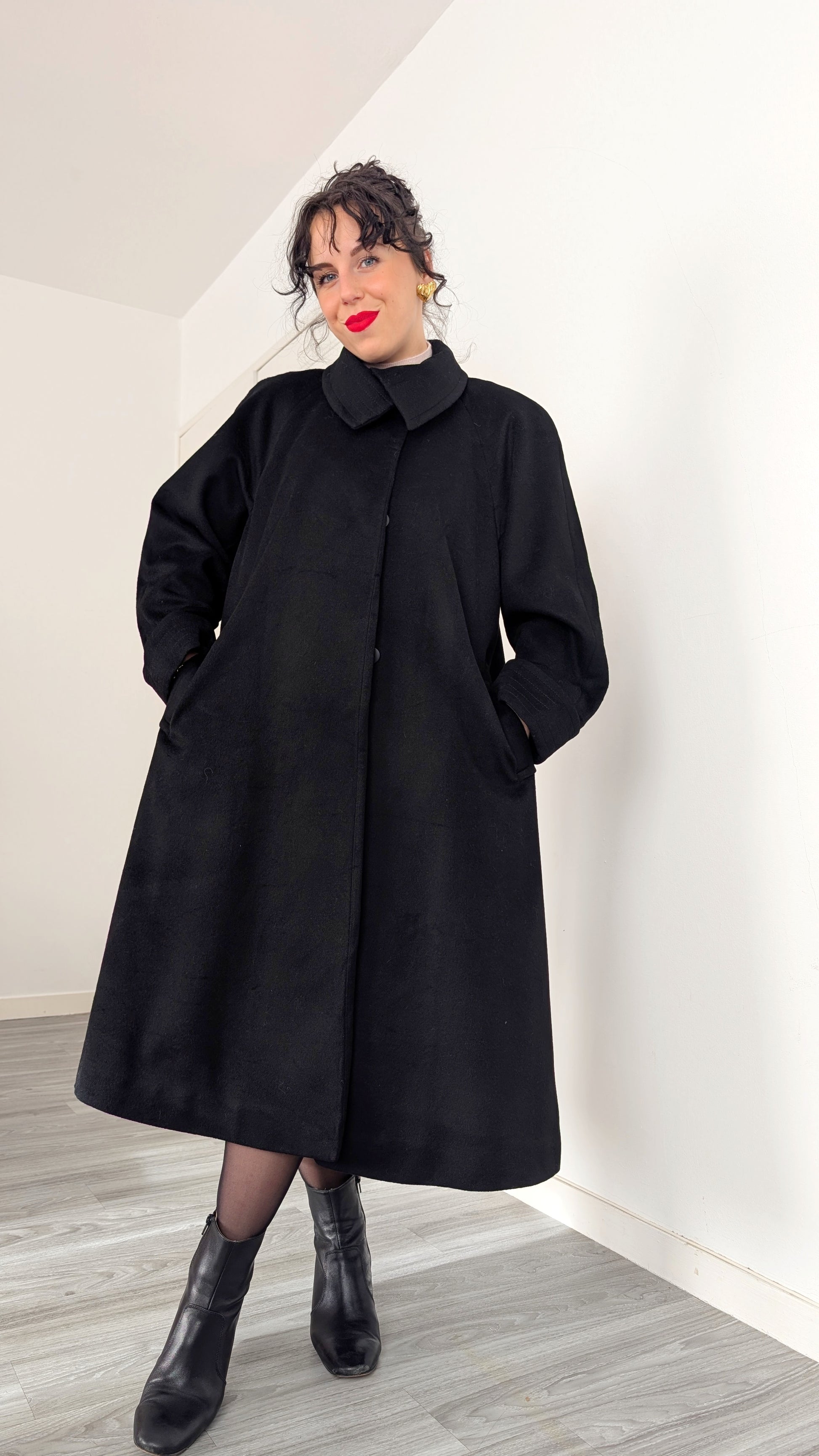 Détails : années 1980, superbe coupe inspiré des années 1960, ample au niveau des aisselles et en bas, poches latérales, superbe qualité, matière douce et chaude