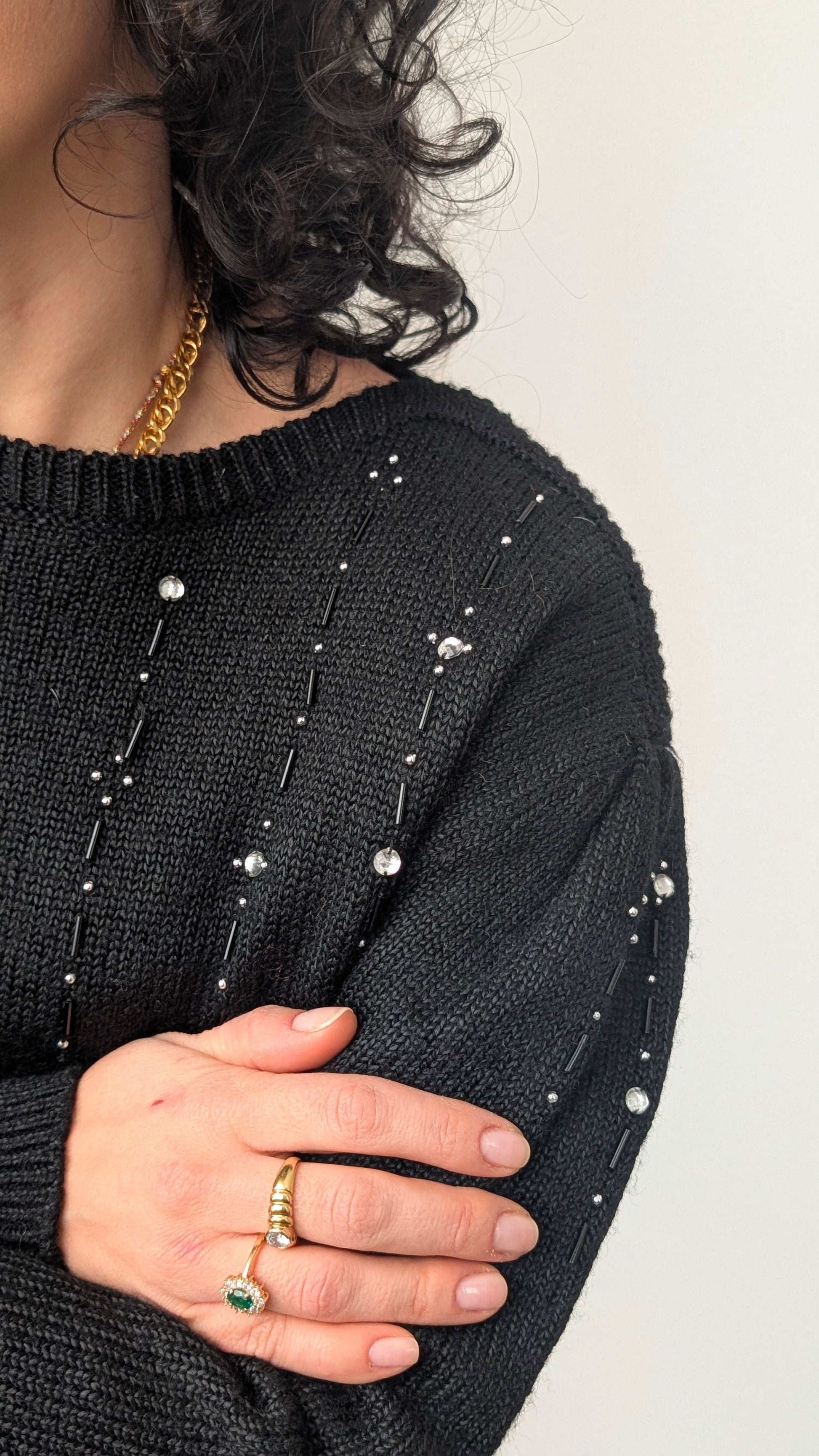 Détails : années 1980, pull festif, des détails cousus sur les manches et la partie frontale, épaules froncées
