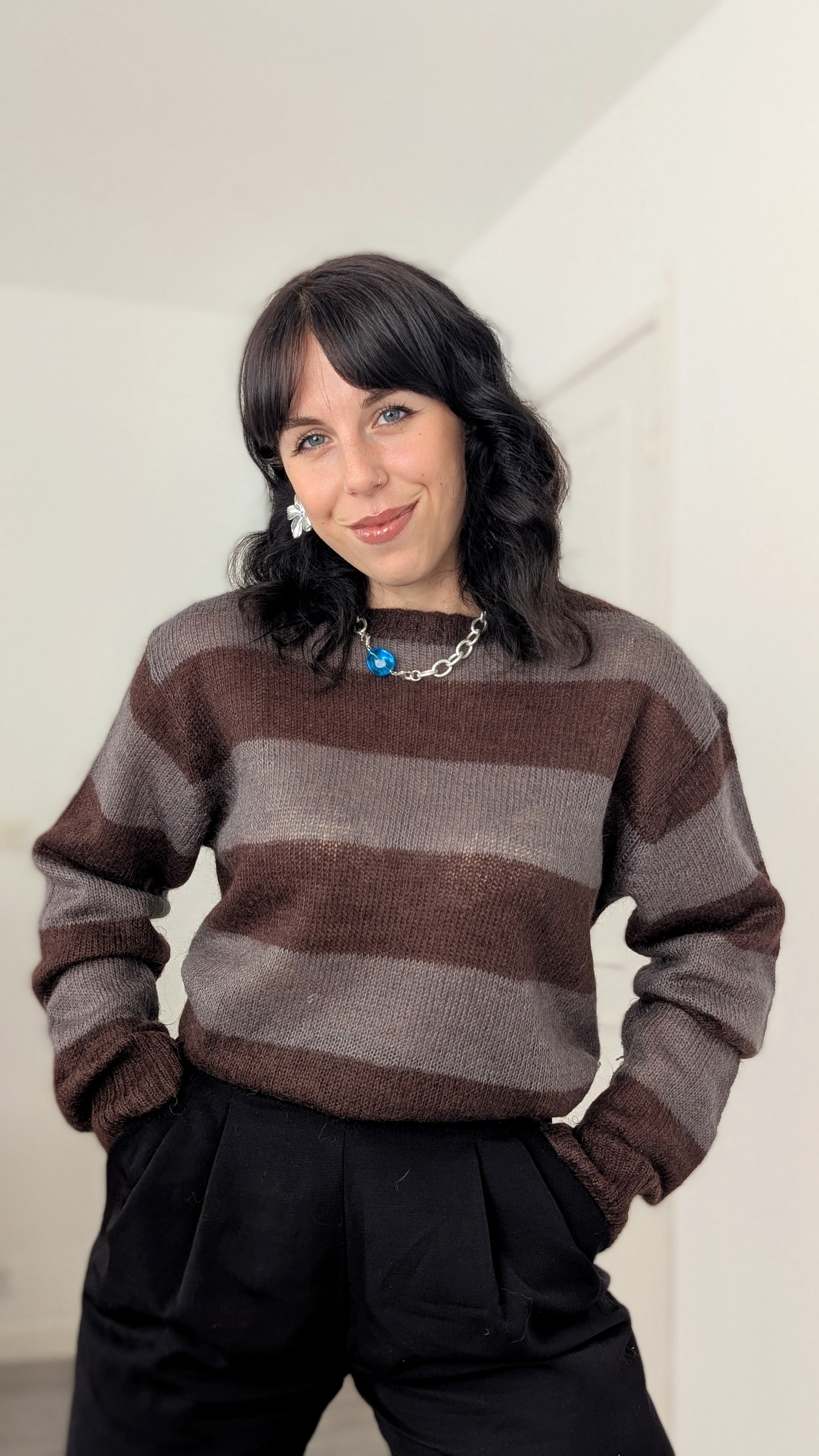 Mensurations : aisselles/buste 55 cm, longueur 65 cm, épaules 53 cm, longueur manches 72 cm