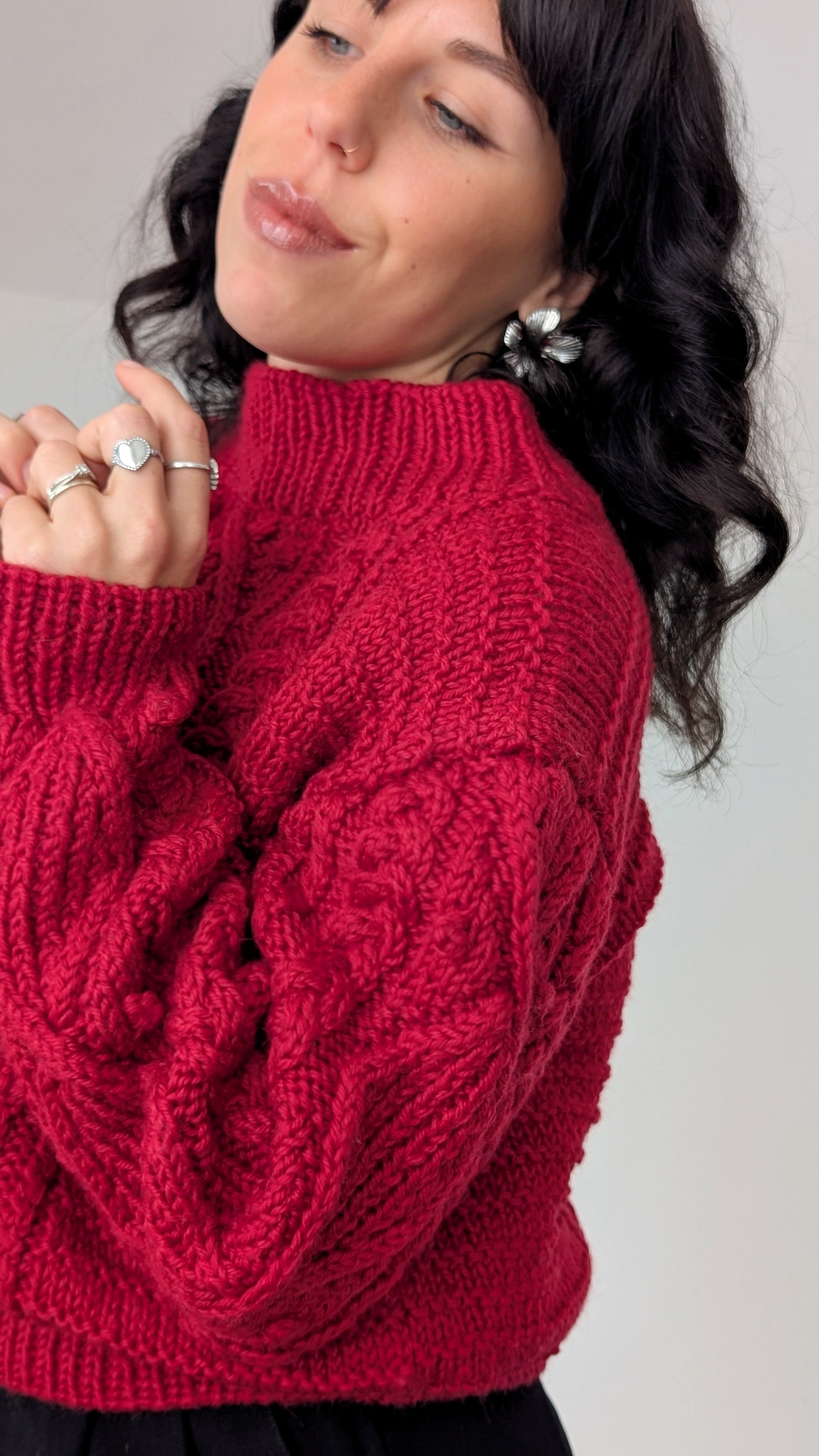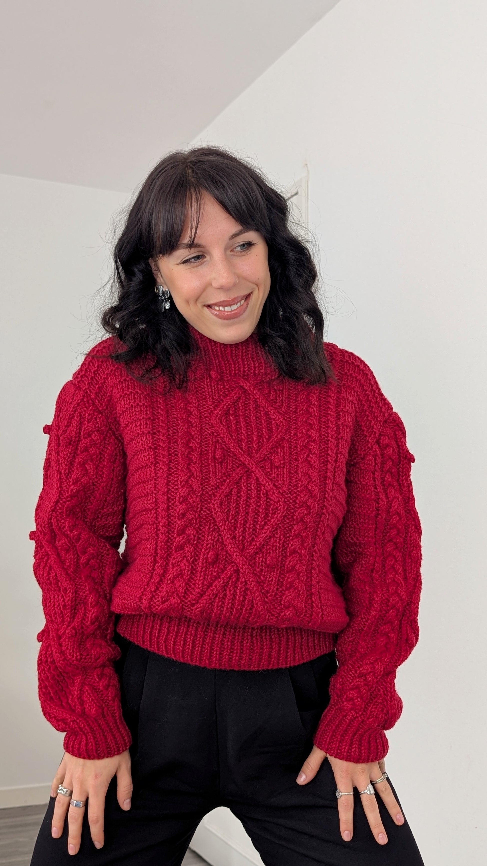 Détails : années 1980, pull tricoté main, coupe légèrement courte à porter avec des tailles hautes, très belle qualité