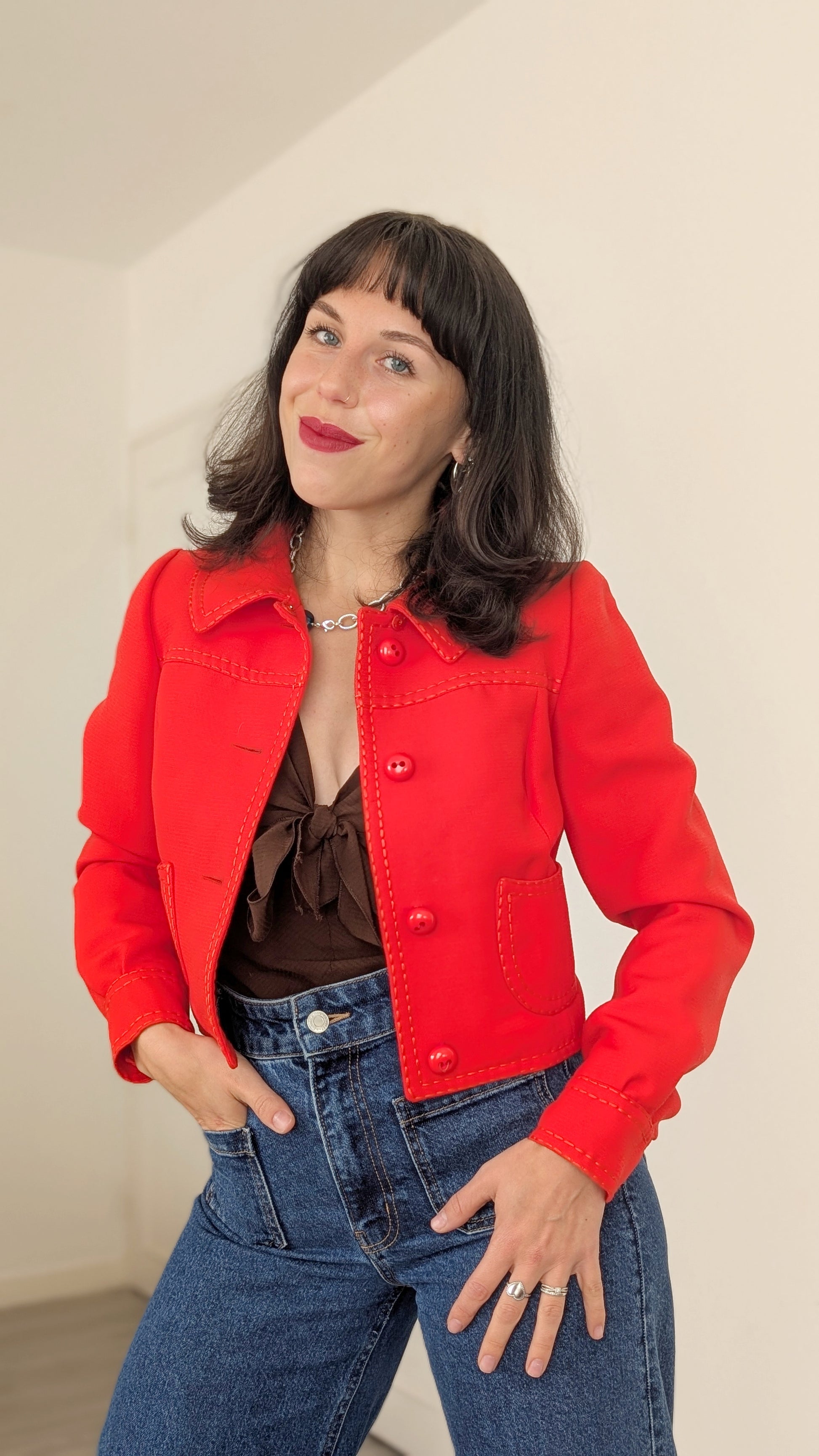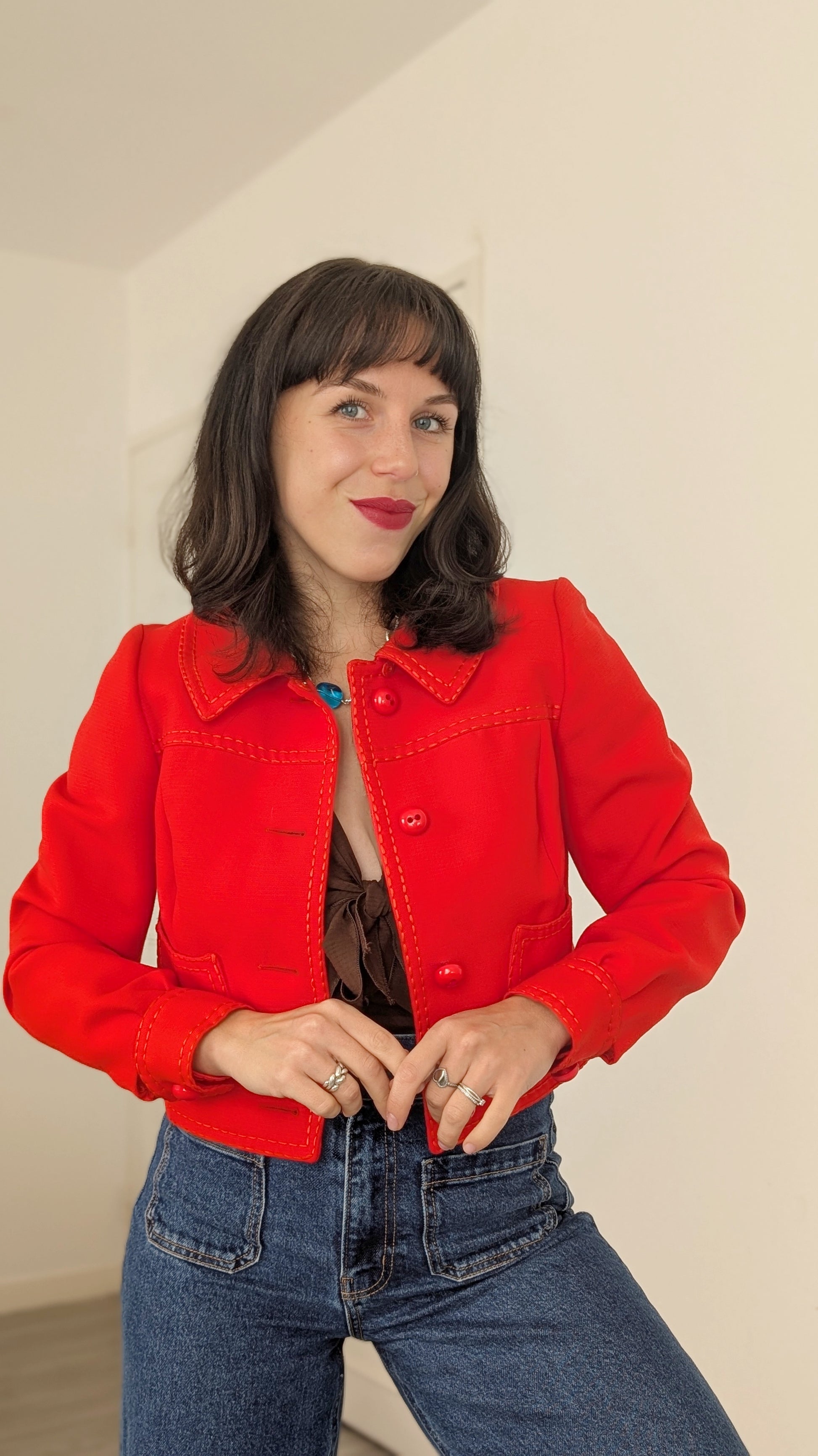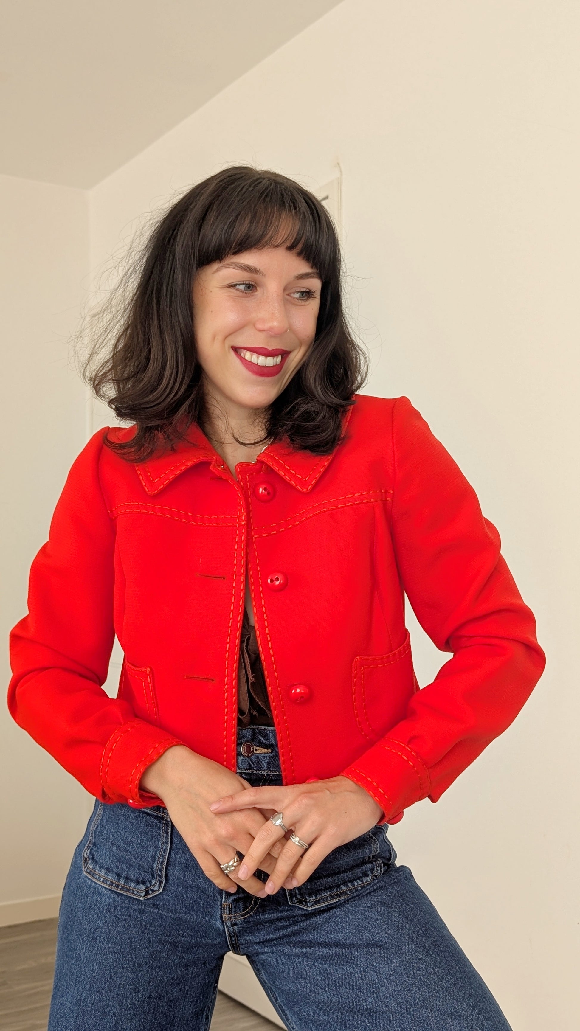 Détails : années 1960, semble être fait main/maison, pièce super rare, coupe courte à porter avec des tailles hautes, doublée, belle structure et finitions, boutons d'origine, possède quelques traces à l'arrière de la veste, voir photos