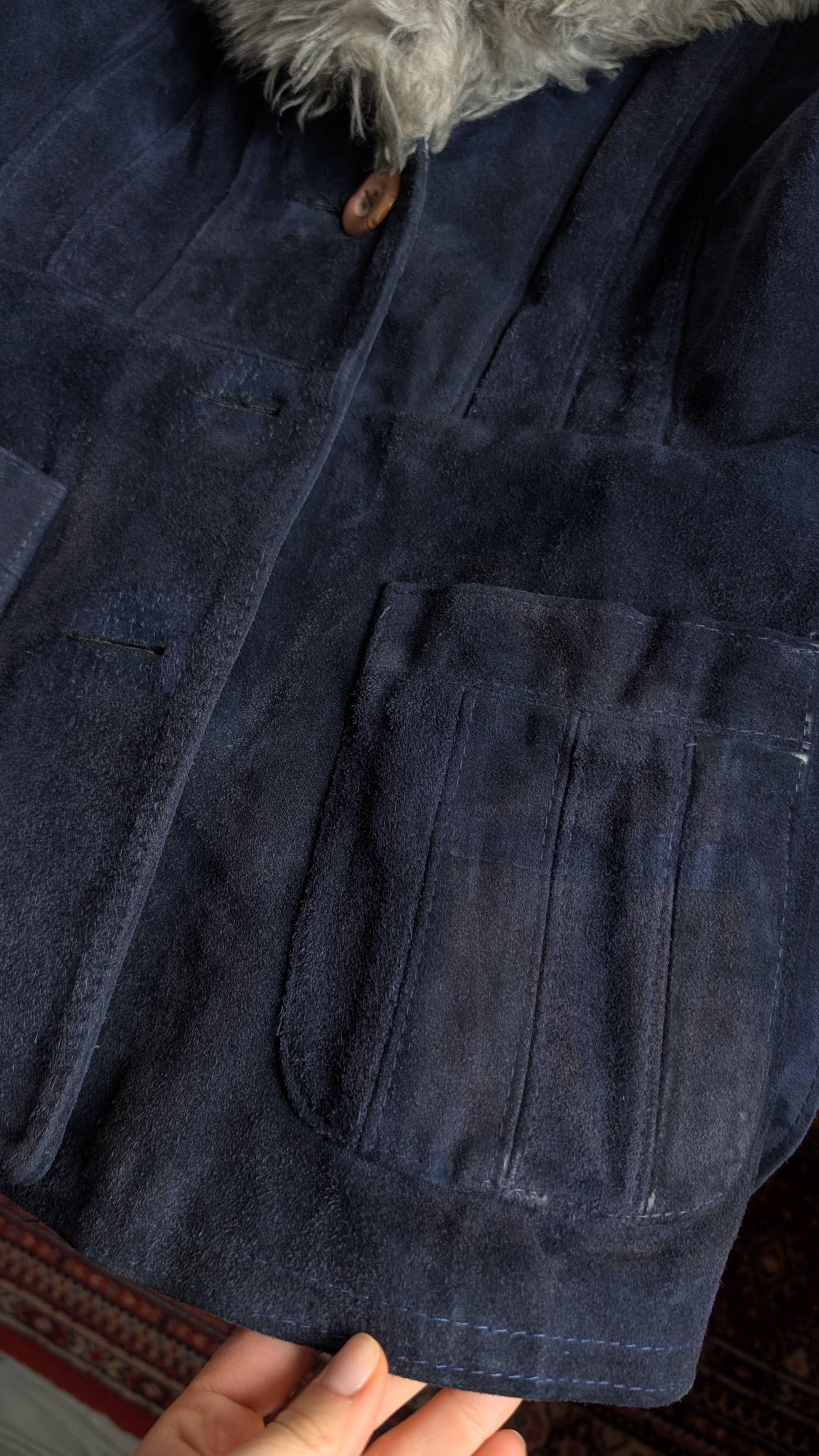 Détails : années 1970, poches latérales, doublé à l'intérieur, superbe coupe qui se resserre à la taille, boutonné sur le devant, le daim à quelques traces de vécu mais reste tout de même dans un bon état général, le daim n'est pas troué ou abîmé, seulement un peu usé sur les manches (voir photos), prix doux