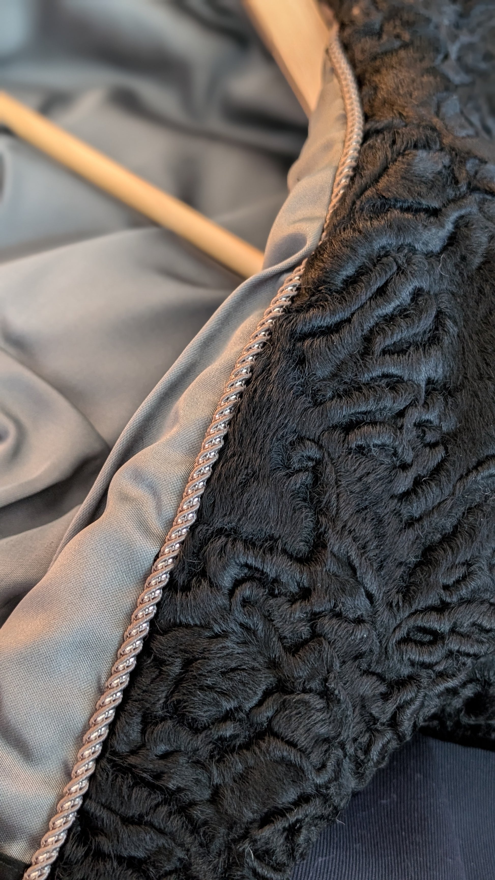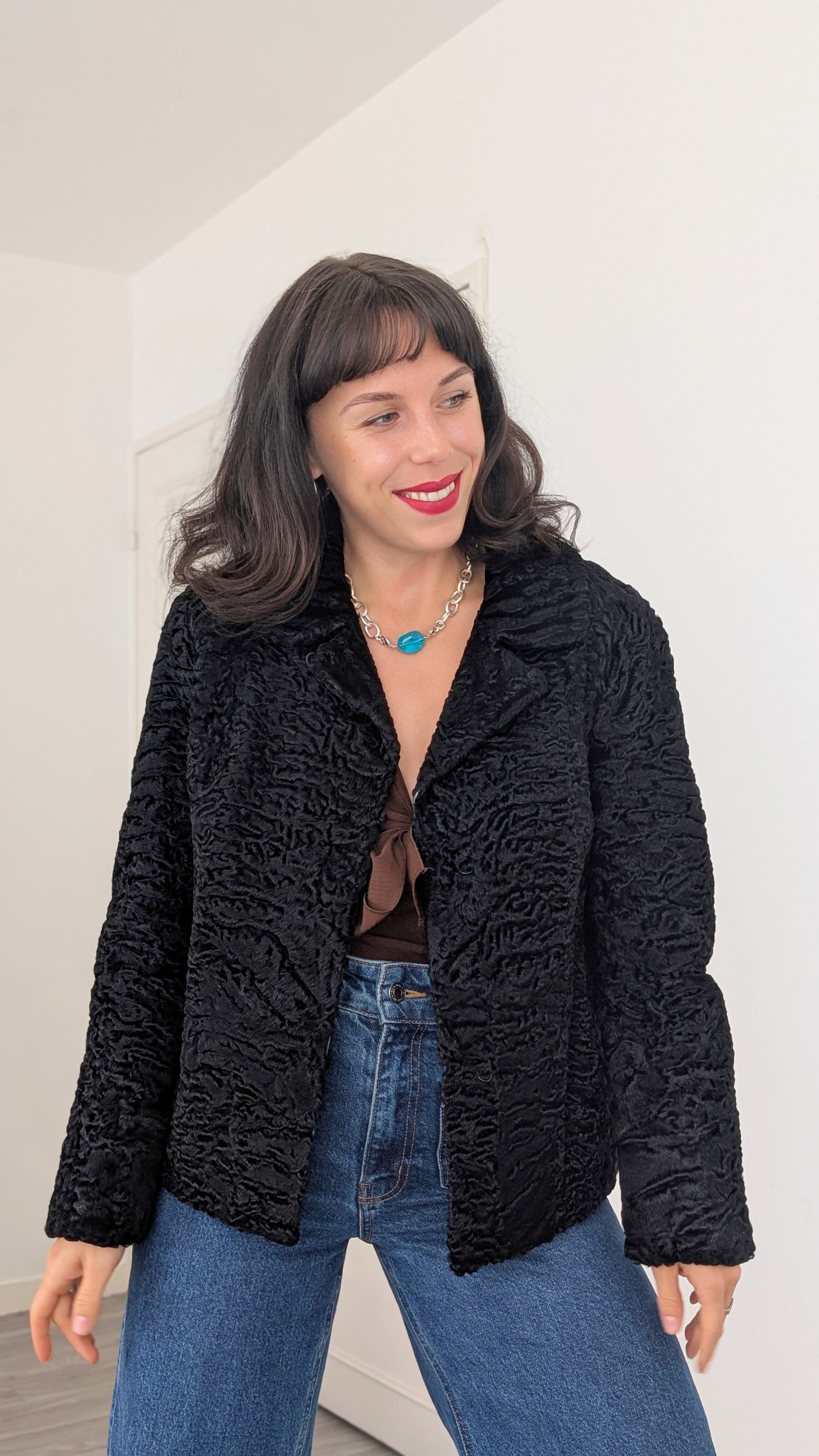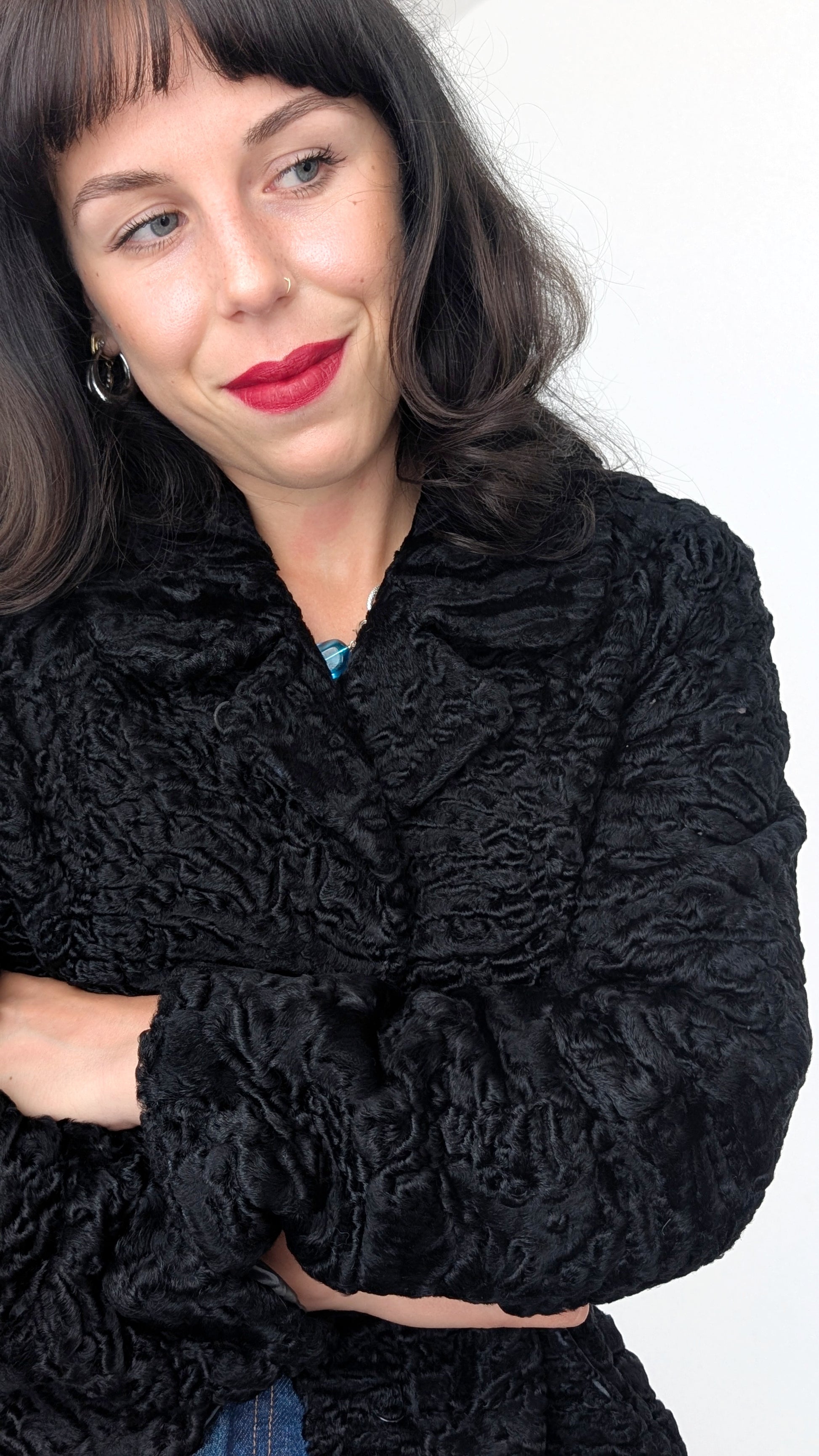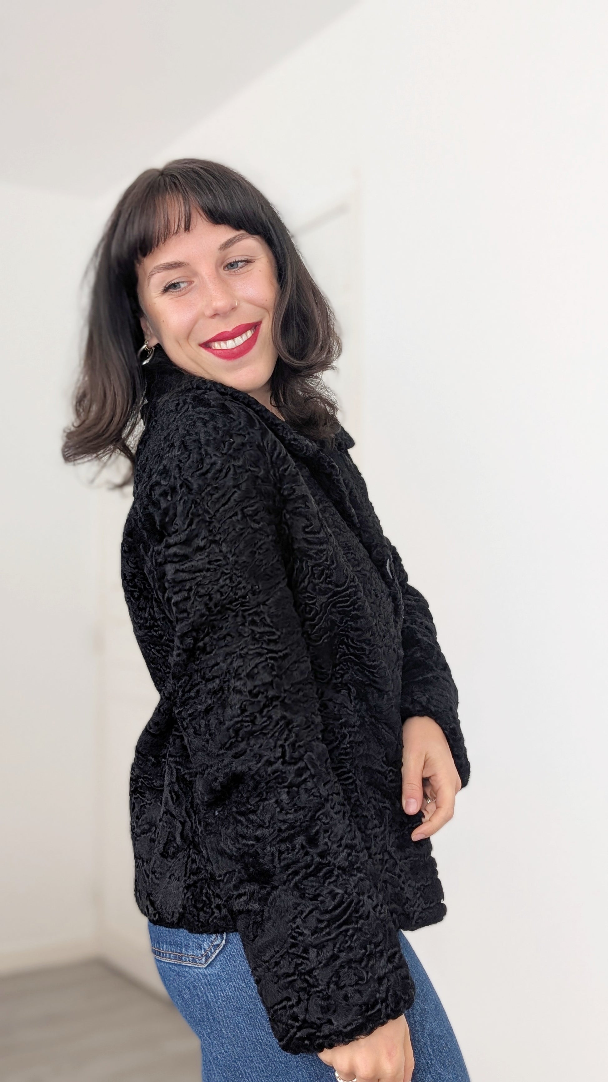 Détails : années 1960, superbe qualité, coupe mi-courte à porter avec des tailles hautes, poches latérales, laine qui provient d'un mouton astrakan persan, très belles finitions, pièce rare dans cette coupe